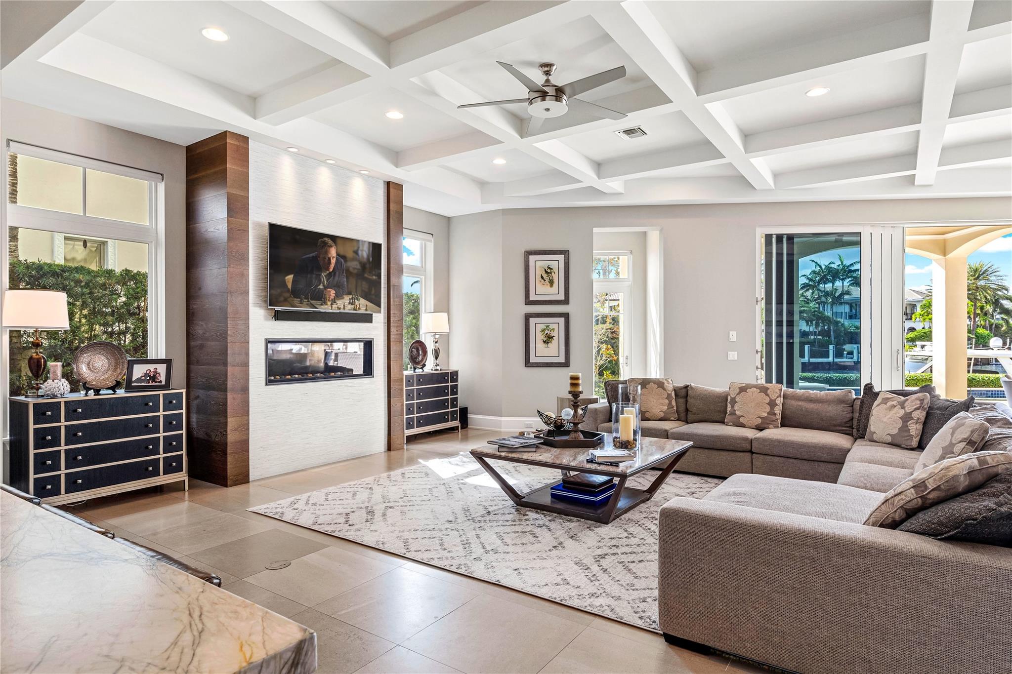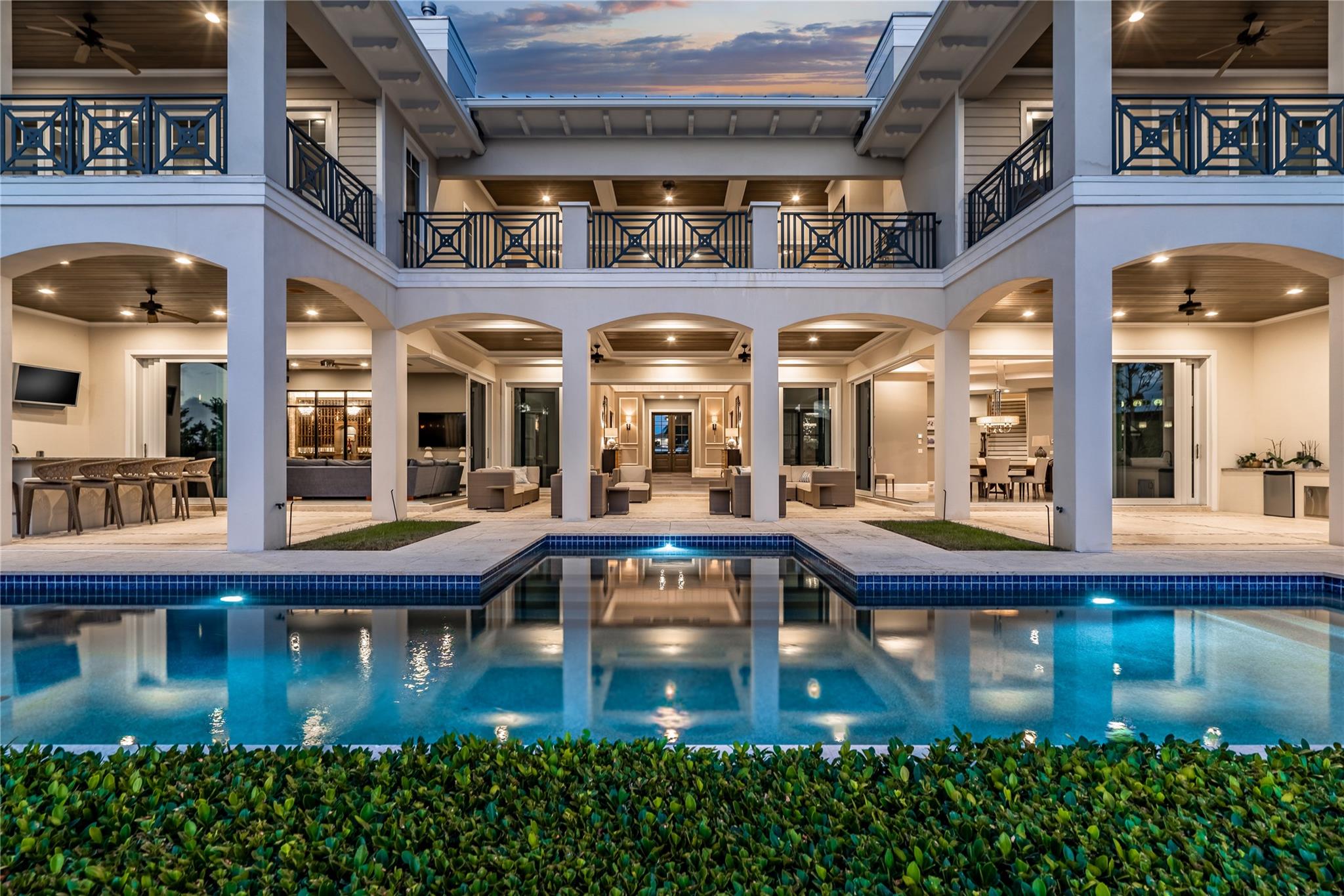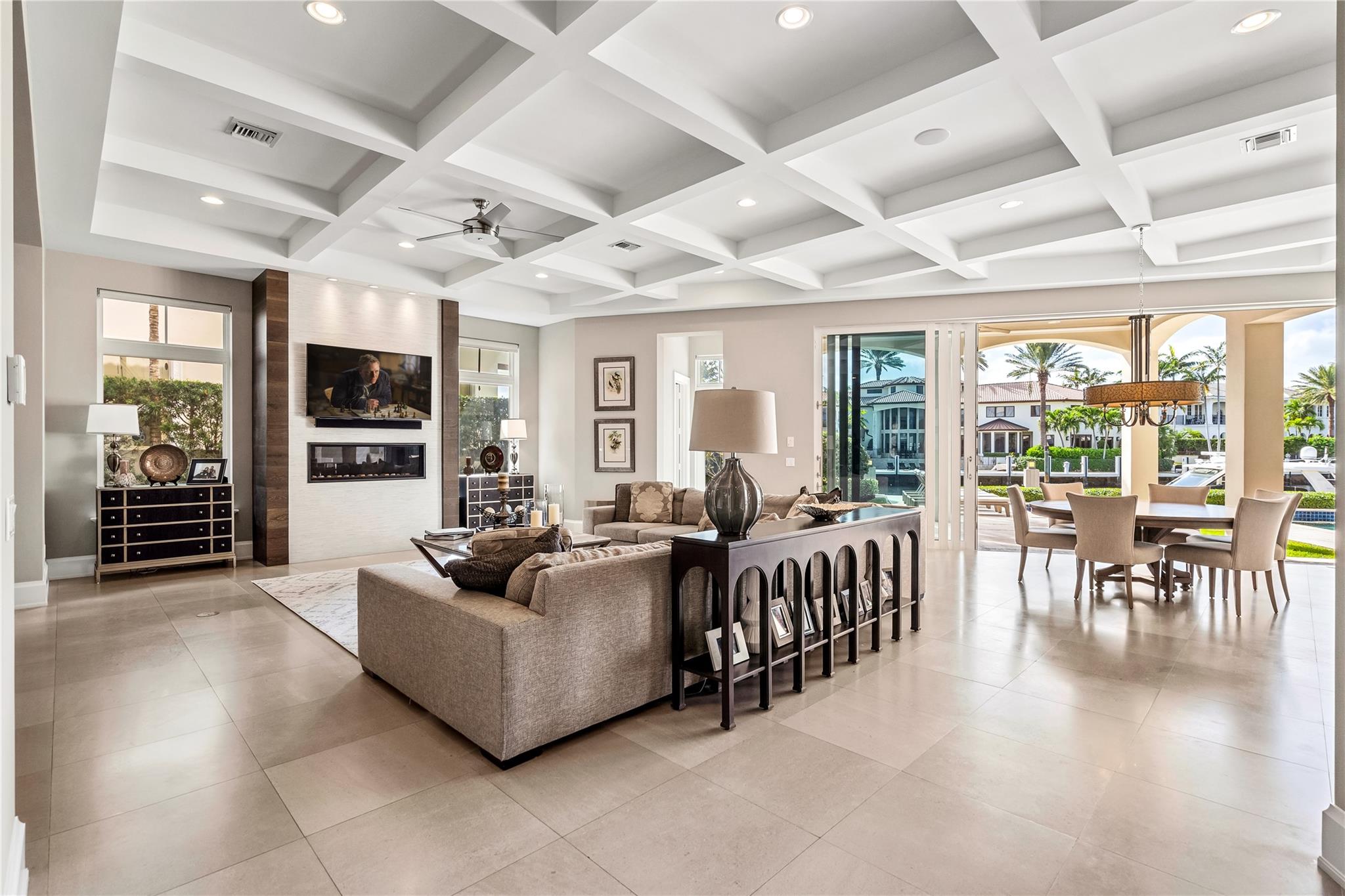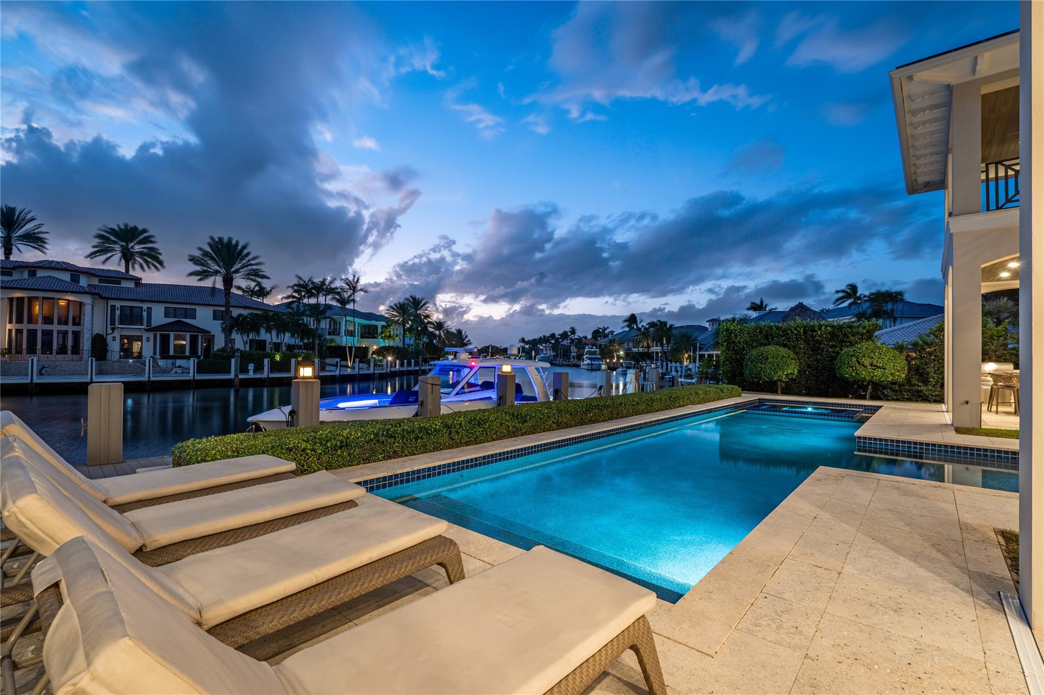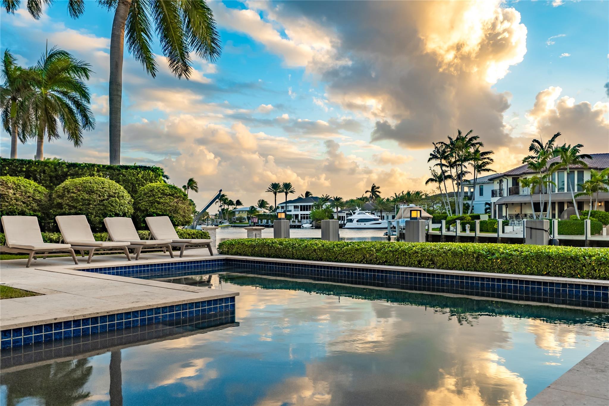 Exceptional coastal-inspired deepwater estate on 87’± of waterfront along wide Cap Knight Bayou, offering spell-binding water views. Crafted by Frankel Estate Homes and designed by Carlos Martin Architect, this residence sets a new standard with superior craftsmanship and materials. The 7-bedroom, 7.5-bath home spans 13,473± total square feet, showcasing wide water views from nearly every major room. The impressive double-island kitchen features custom cabinets and luxe appliances. Features include a 1,350-bottle wine cellar, full bar, elevator, office, 4-bay garage, generator, and more. Outdoor entertainment awaits with an expansive lanai, resort-style pool/patio, and covered summer kitchen. Ideal for avid boater, the full-service composite yacht dock is just minutes to Hillsboro Inlet.
