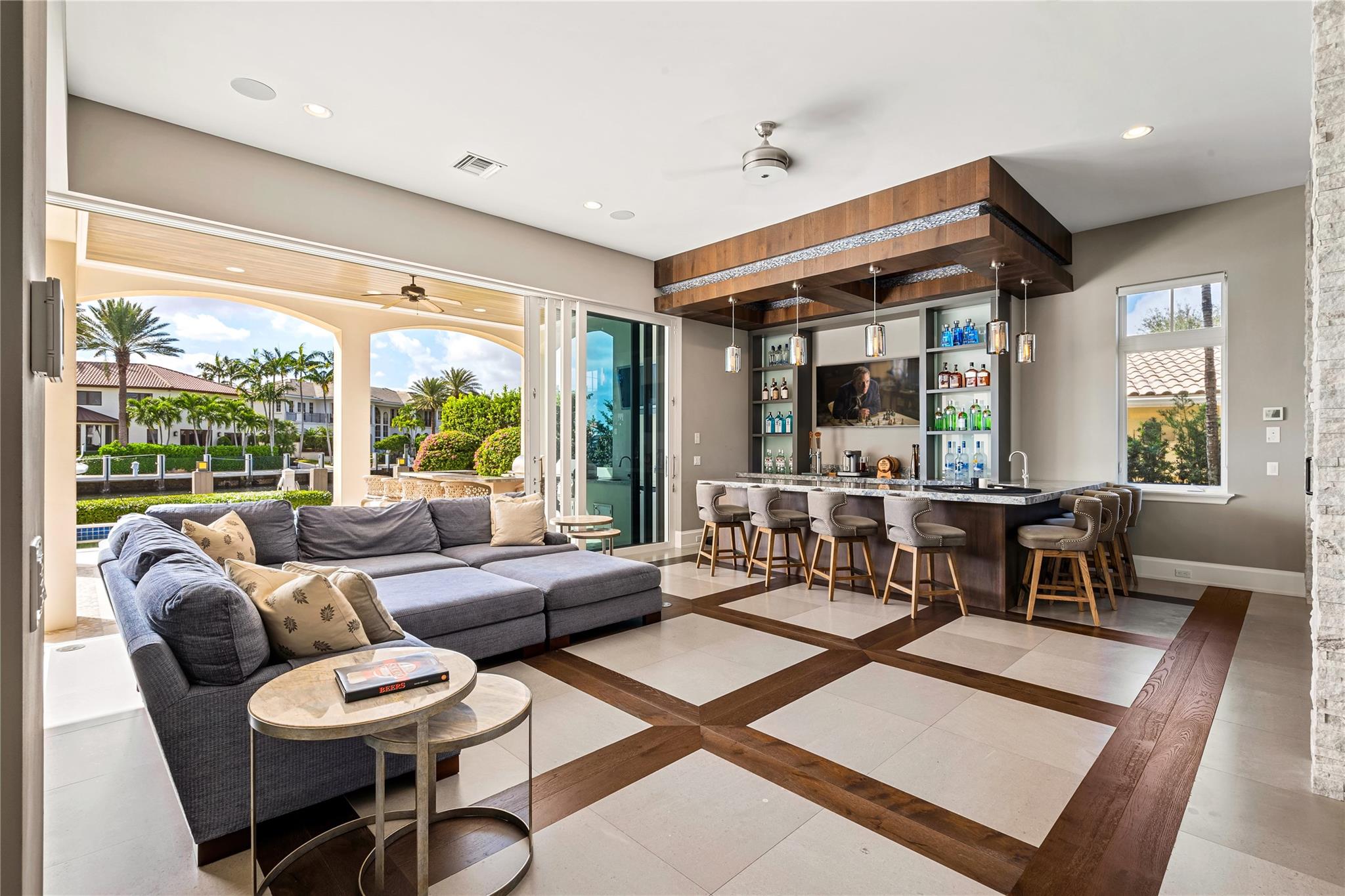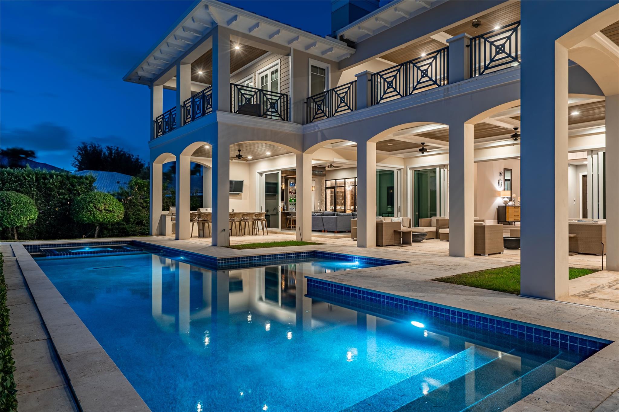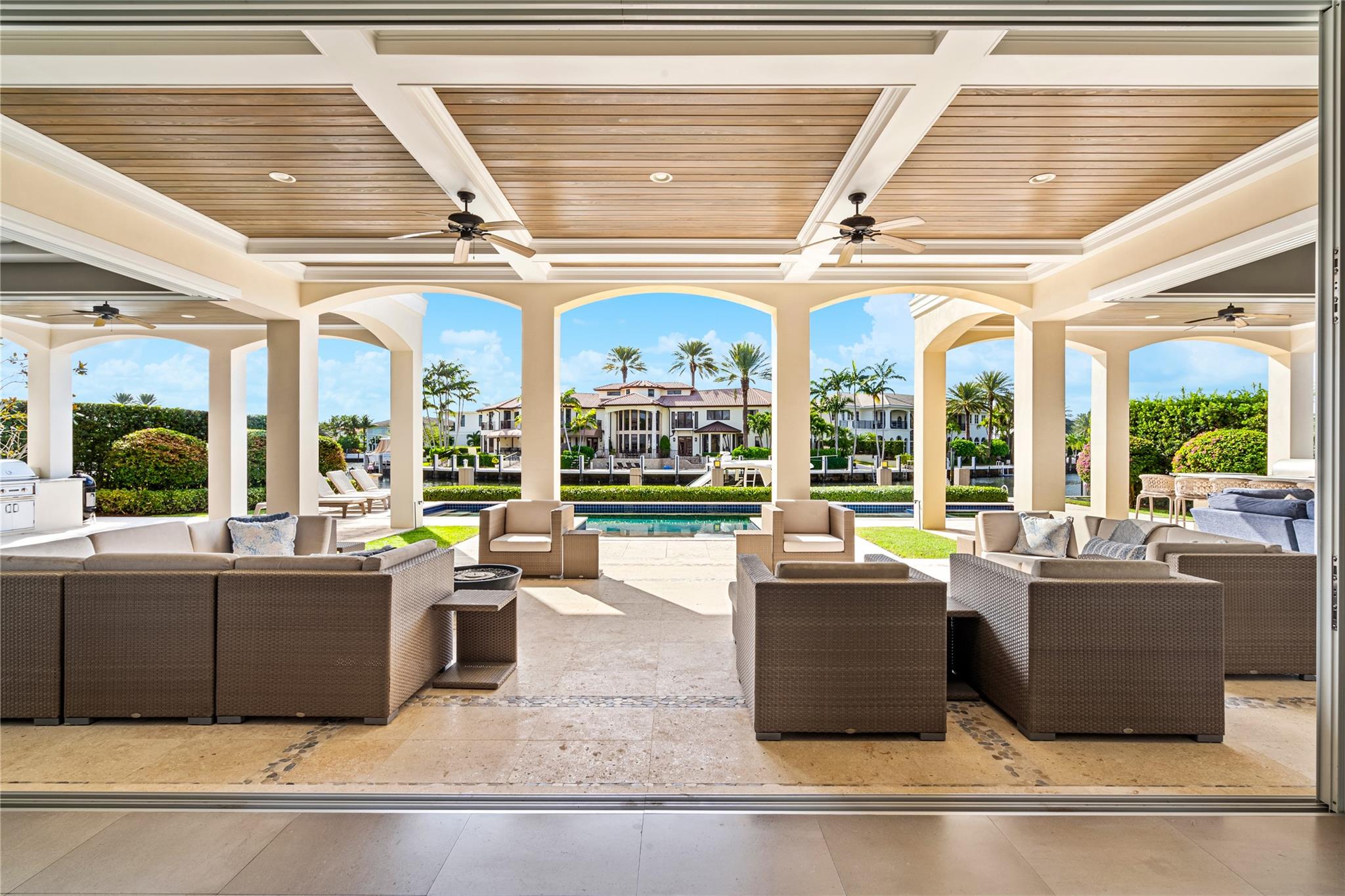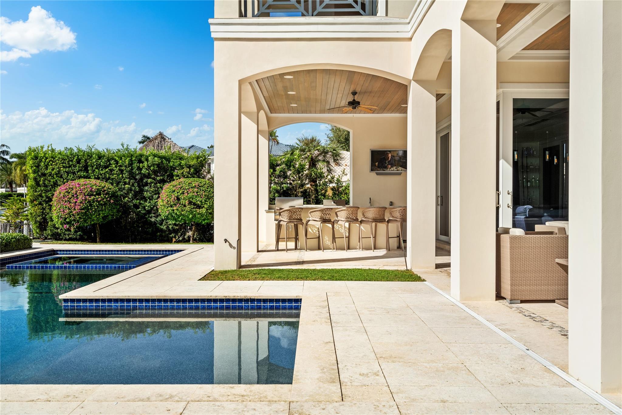 Exceptional coastal-inspired deepwater estate on 87’± of waterfront along wide Cap Knight Bayou, offering spell-binding water views. Crafted by Frankel Estate Homes and designed by Carlos Martin Architect, this residence sets a new standard with superior craftsmanship and materials. The 7-bedroom, 7.5-bath home spans 13,473± total square feet, showcasing wide water views from nearly every major room. The impressive double-island kitchen features custom cabinets and luxe appliances. Features include a 1,350-bottle wine cellar, full bar, elevator, office, 4-bay garage, generator, and more. Outdoor entertainment awaits with an expansive lanai, resort-style pool/patio, and covered summer kitchen. Ideal for avid boater, the full-service composite yacht dock is just minutes to Hillsboro Inlet.