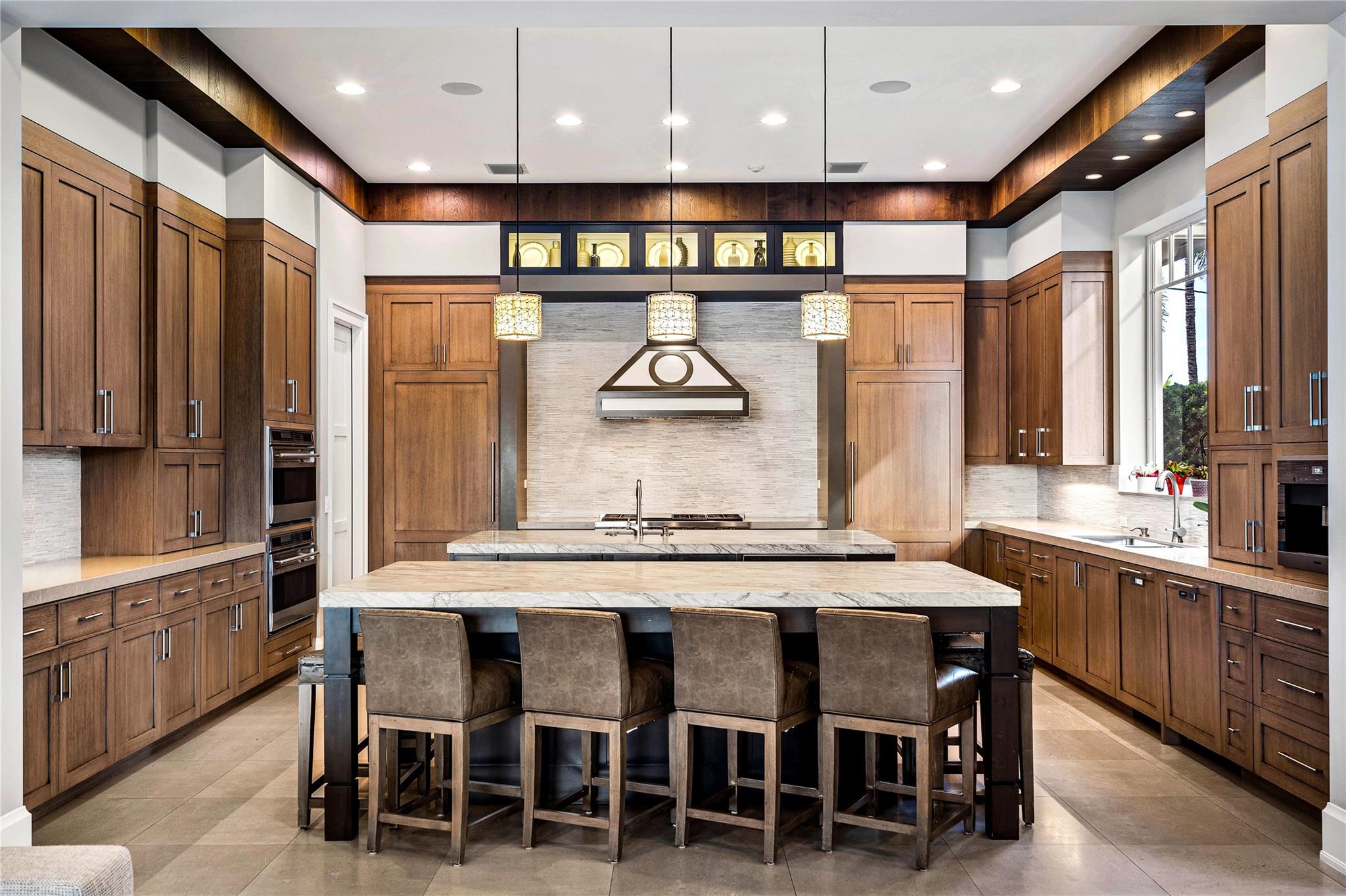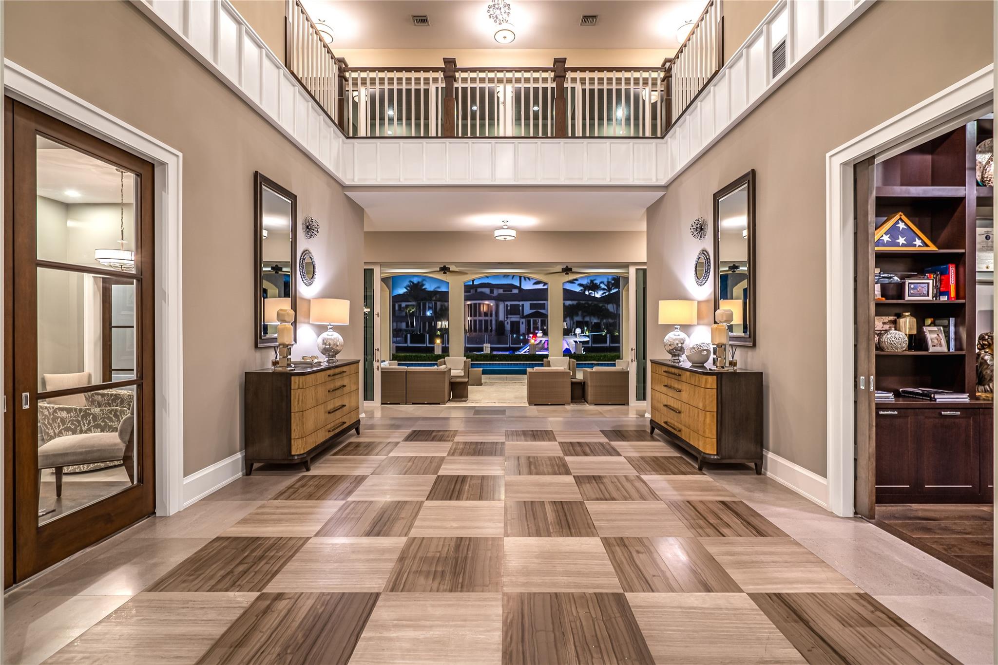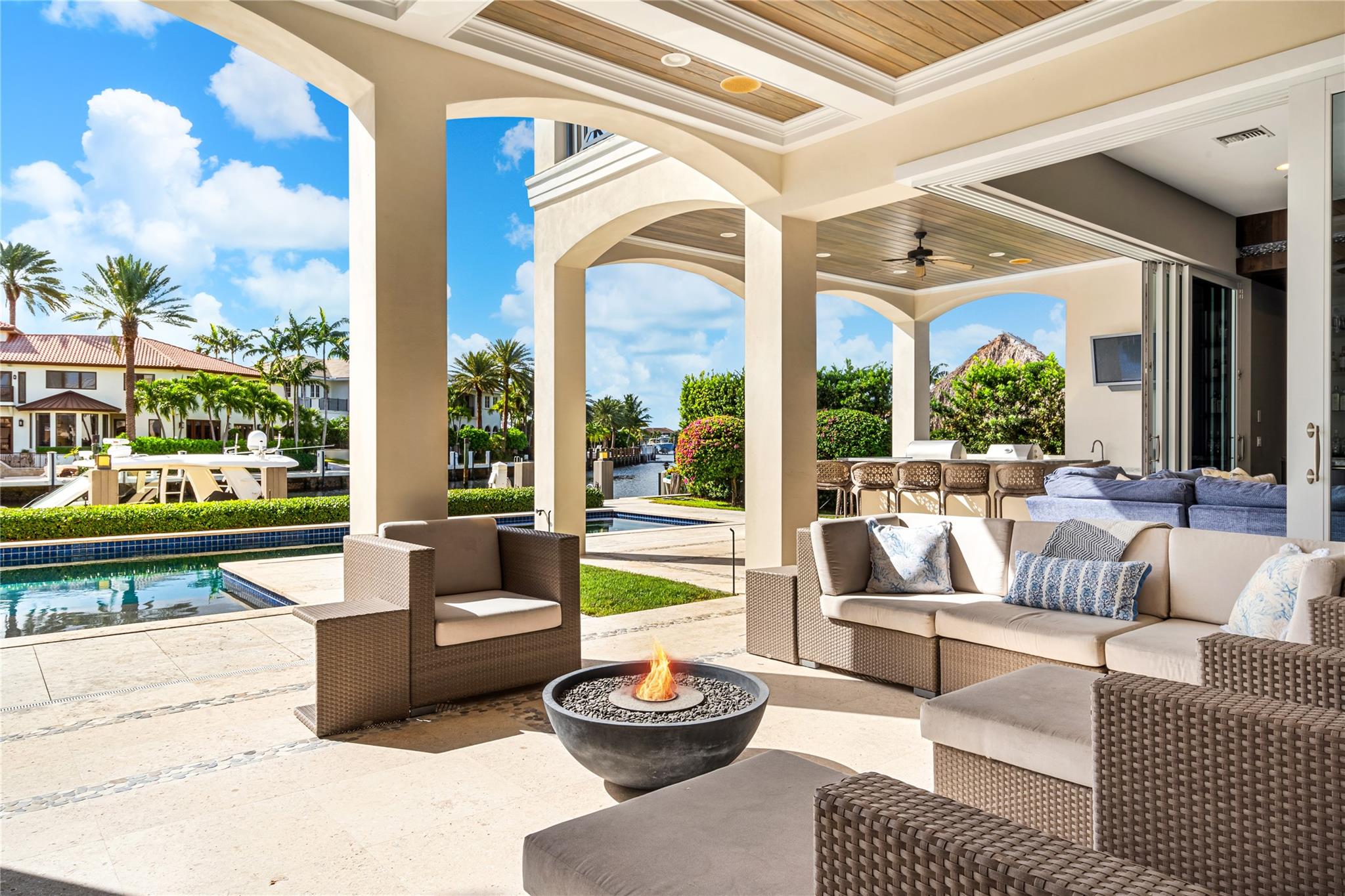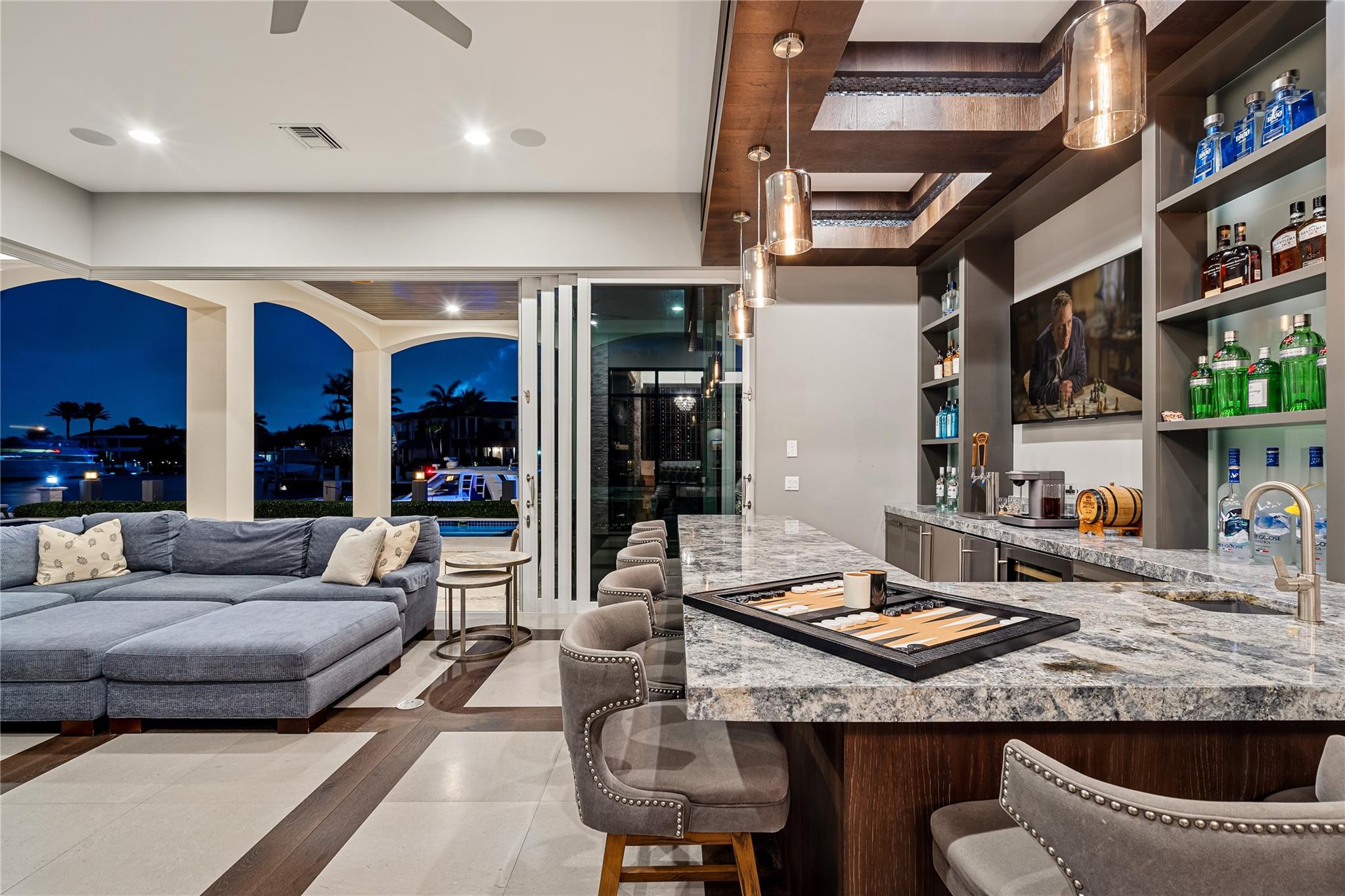 Exceptional coastal-inspired deepwater estate on 87’± of waterfront along wide Cap Knight Bayou, offering spell-binding water views. Crafted by Frankel Estate Homes and designed by Carlos Martin Architect, this residence sets a new standard with superior craftsmanship and materials. The 7-bedroom, 7.5-bath home spans 13,473± total square feet, showcasing wide water views from nearly every major room. The impressive double-island kitchen features custom cabinets and luxe appliances. Features include a 1,350-bottle wine cellar, full bar, elevator, office, 4-bay garage, generator, and more. Outdoor entertainment awaits with an expansive lanai, resort-style pool/patio, and covered summer kitchen. Ideal for avid boater, the full-service composite yacht dock is just minutes to Hillsboro Inlet.