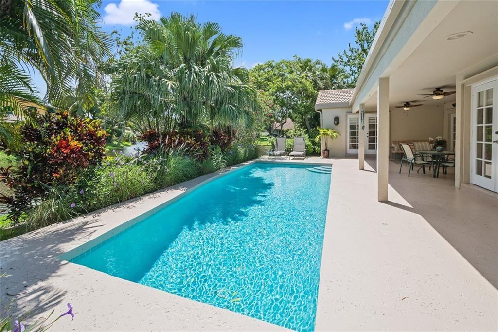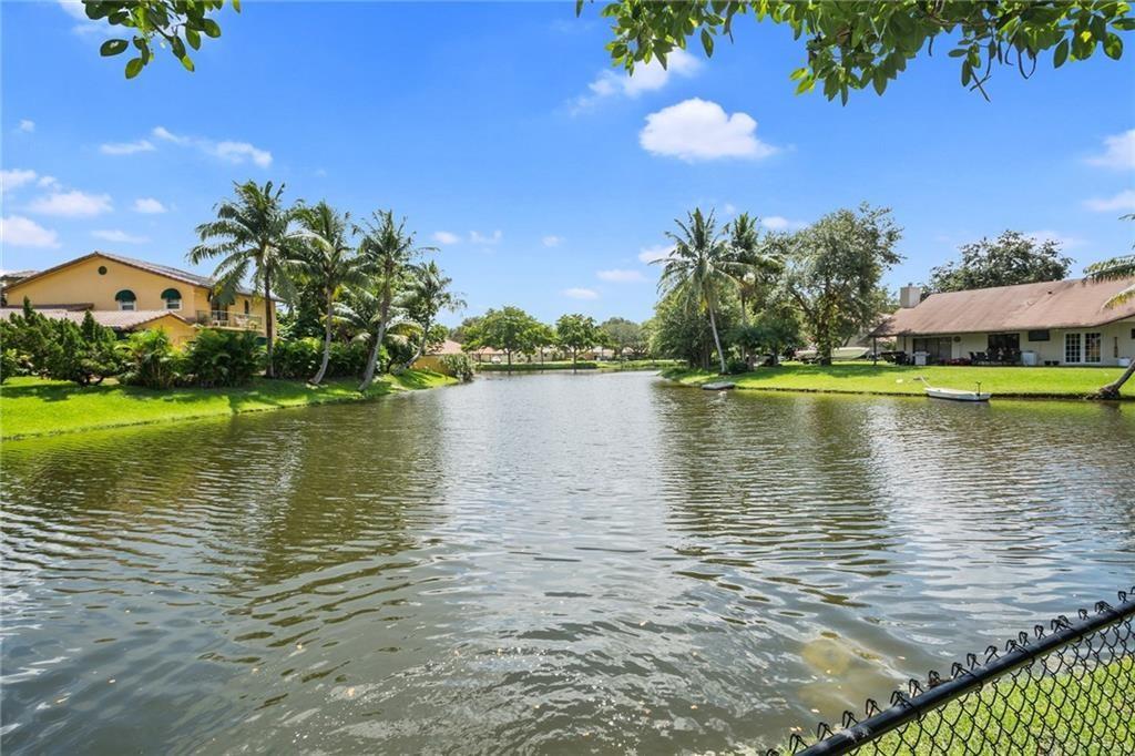Charming 3 bedroom 2 bath waterfront home tucked in cul-de-sac with sparkling pool! Large patio and fenced yard perfect for pets and entertaining. Recent upgrades include updated white kitchen featuring quartz counters, subway tile backsplash and stainless appliances. Design features include vaulted ceilings with sky lights, French doors, large easy to care for ivory tiles and updated bath. Large master retreat boasts 4 closets, vaulted ceilings plus spa bath with 2 sinks, spacious shower and huge whirlpool tub. Convenient location with neighborhood Greenway for walking, biking and enjoying the Florida lifestyle! Jacaranda offers 2 championship 18 hole golf courses in the center of your neighborhood!