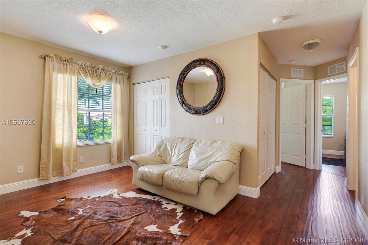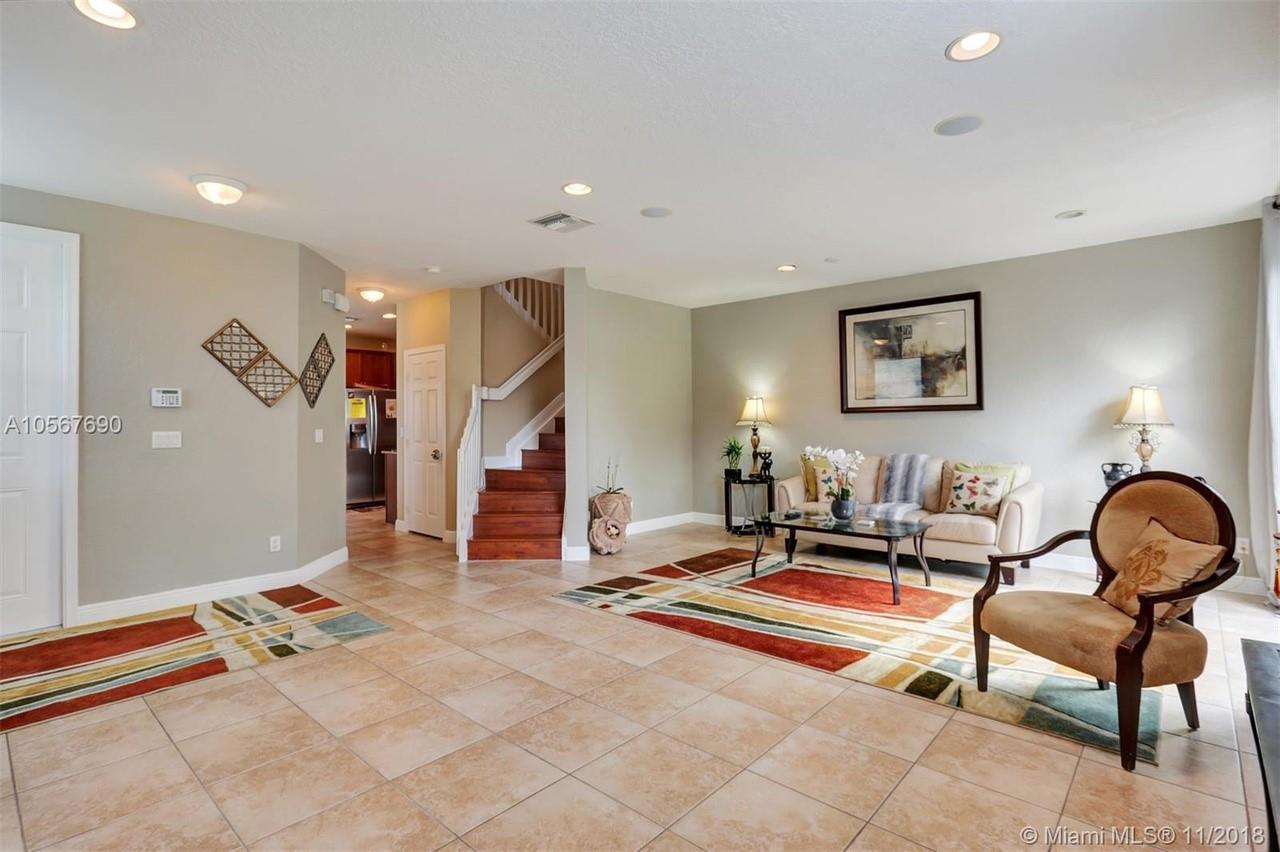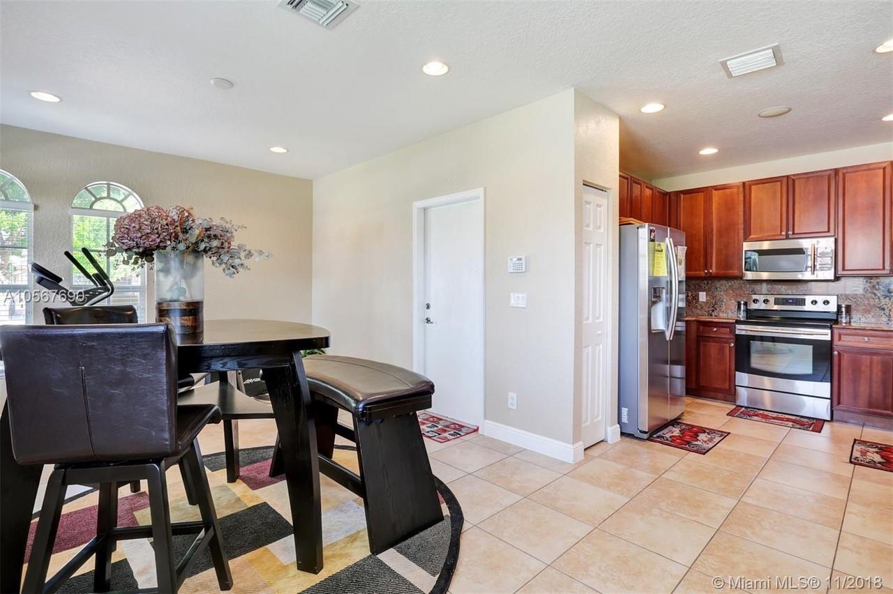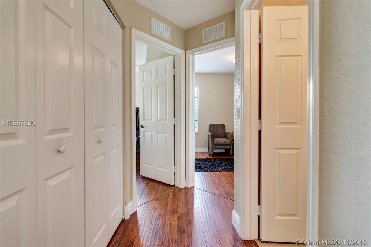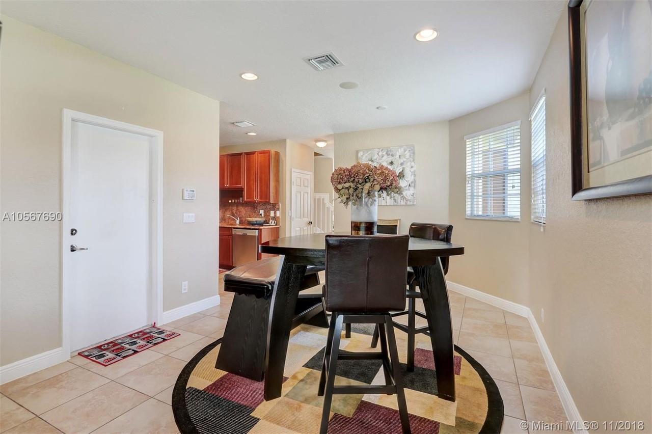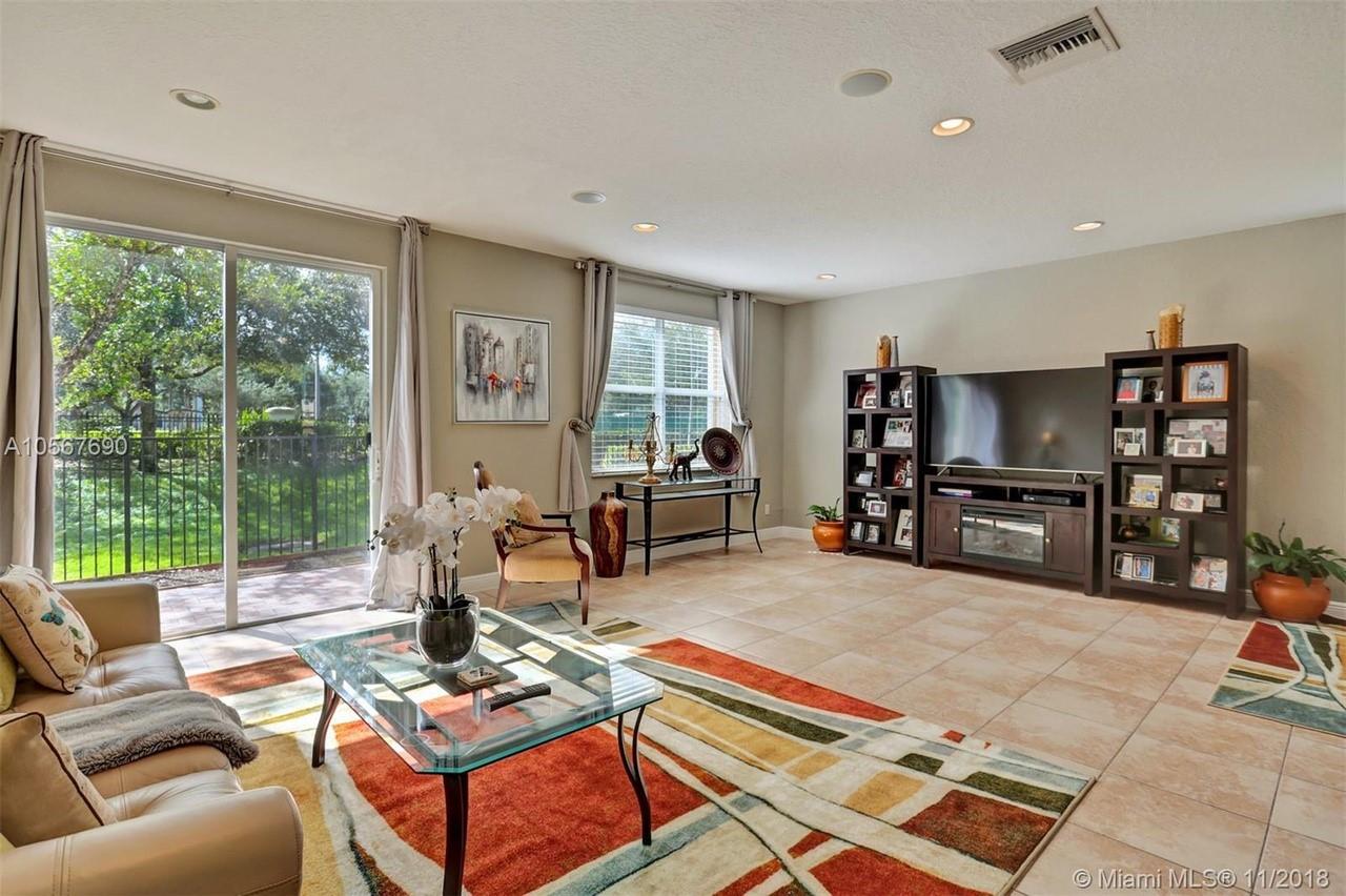 Picture perfect! Corner unit townhome in sought after community .One of few units with a fenced wraparound yard!Located across the community pool & on a dead-end street. This home offers an open floor plan with high ceilings, tile floors throughout 1st floor, lots of windows bringing in natural lights. Beautiful redone kitchen. Nice size Family room. Upstairs features gorgeous wood floors throughout, large Master bedroom with a walk-in closet, vaulted ceilings. Remodeled Master bath with walk-in shower, Granite top vanity with 2 sinks, Laundry closet upstairs, mounted ceiling speakers throughout the home, Accordion shutters in back and on the side windows on both floors, along with hurricane impact windows in front. Top rated schools. Homes in this community rarely become available. Hurry!