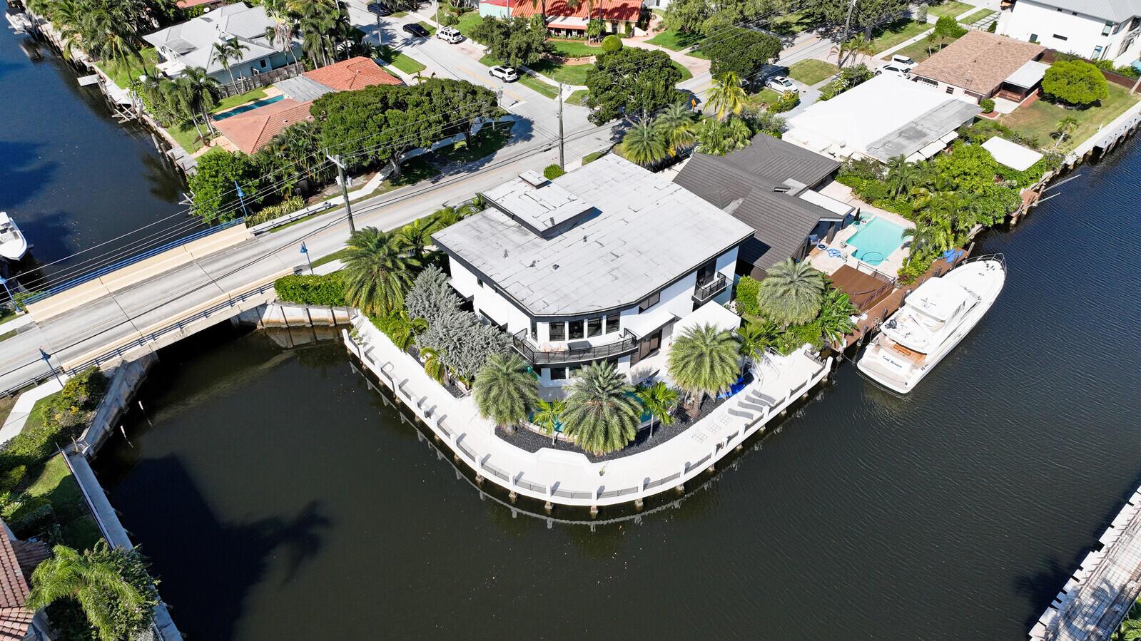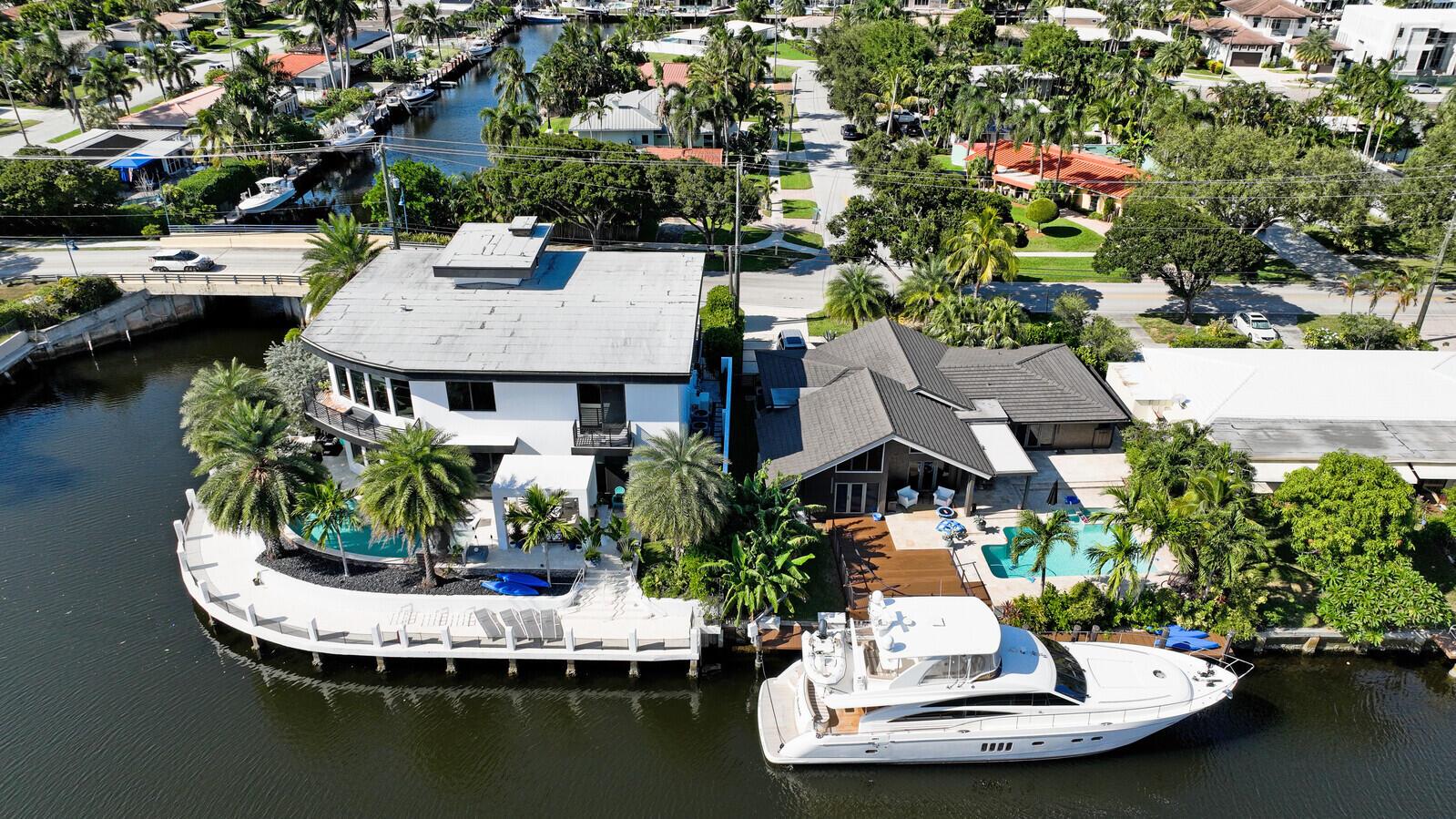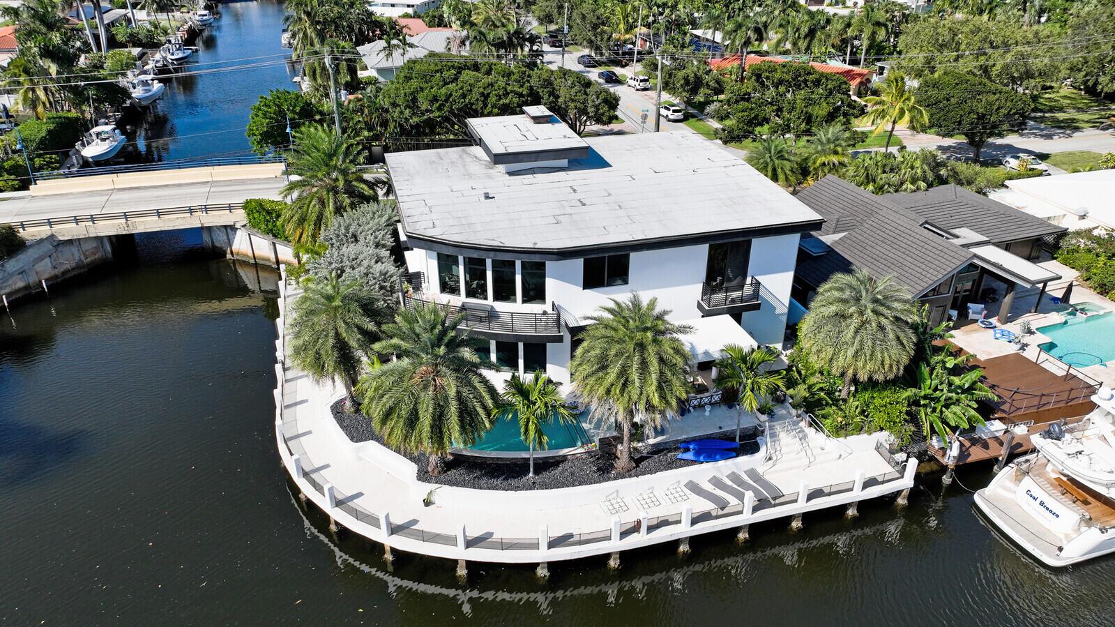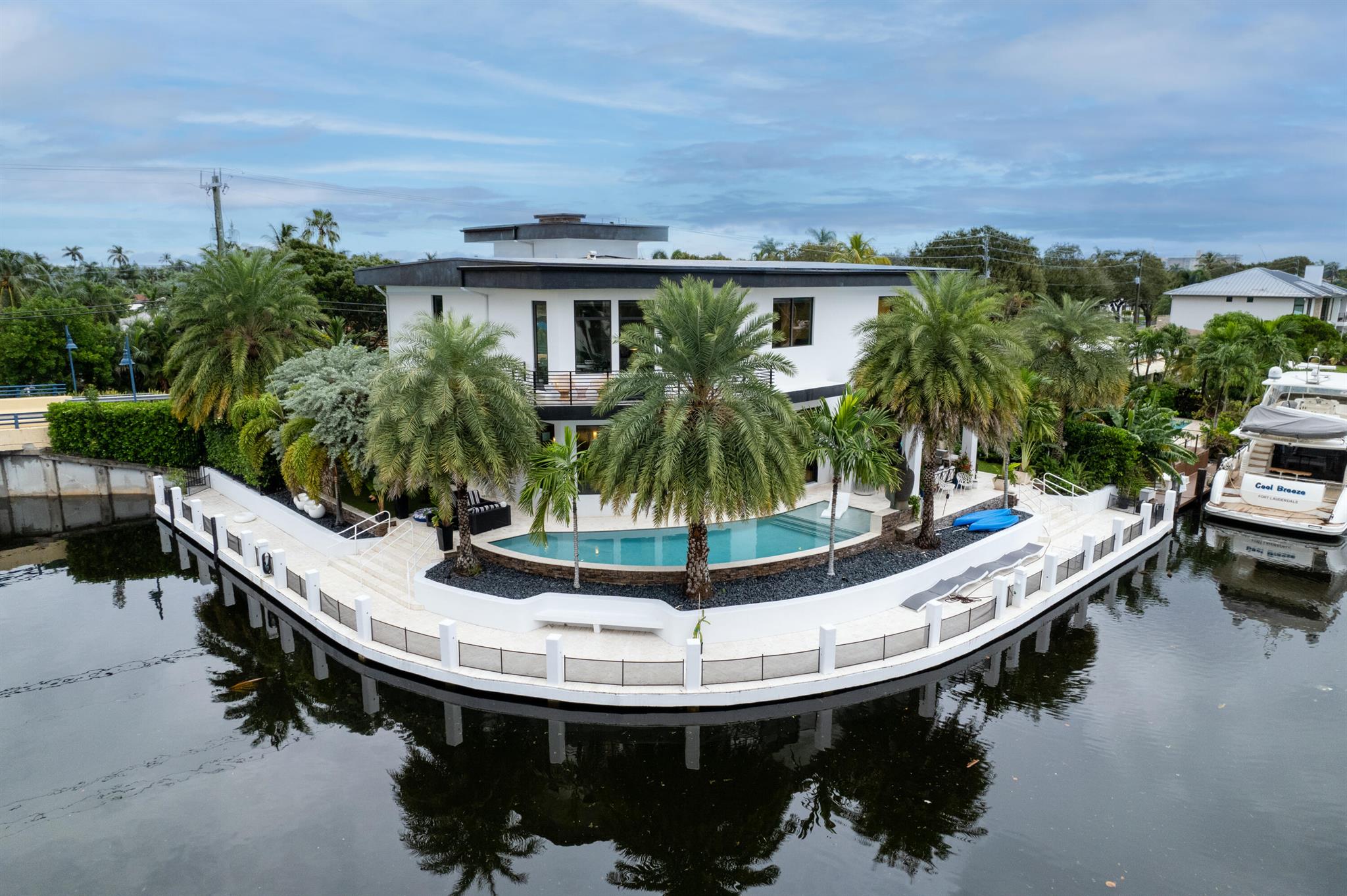 Exceptional Point Lot with 195ft of prime waterfrontage and just minutes away from the intracoastal with easy ocean access and no fixed bridges!! Entertain your guests and family all year long with your gorgeous wrap around salt water pool that is both heated and cooled! Enjoy the abundance of space and light with the morning sunrises gleaming off the water and through your large windows giving you a sense of happiness every morning and night! With 5 extraordinary bedrooms and 6.5 sleek and modern baths, this is a true example of luxurious waterfront living! Rare opportunity to even purchase the home next door as a package if you would like to expand your water frontage and living space! Plenty of room for the toys with a 3 car garage that has AC! Schedule your private tour today!