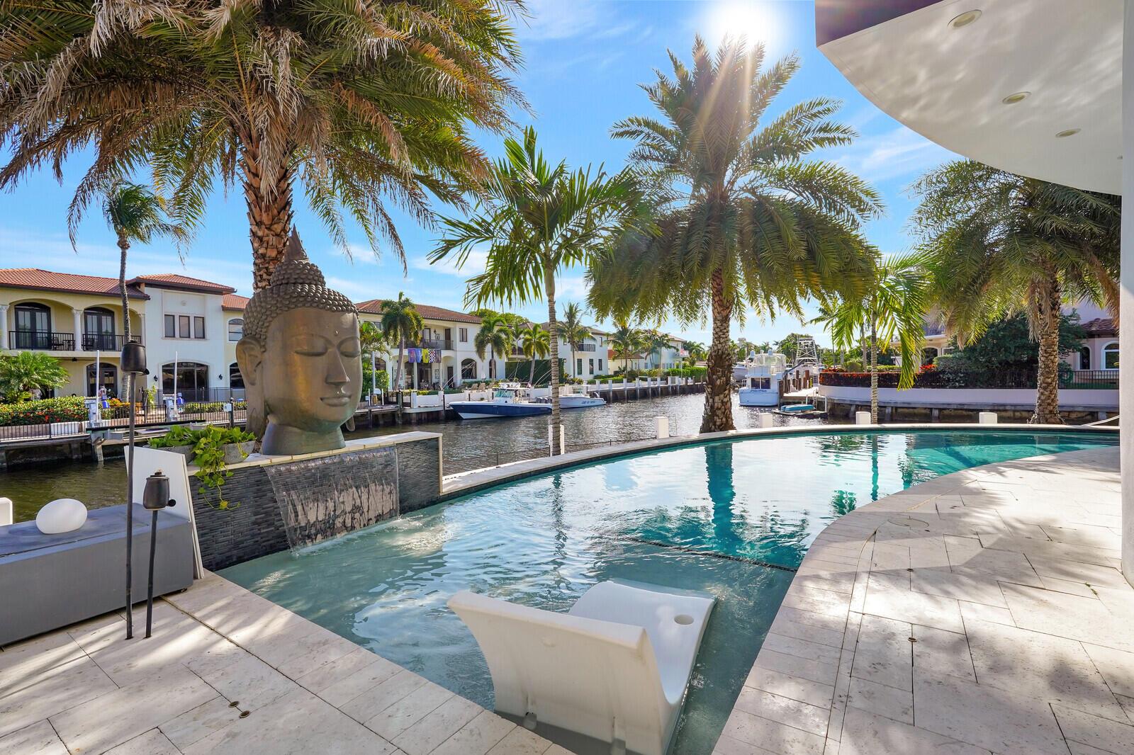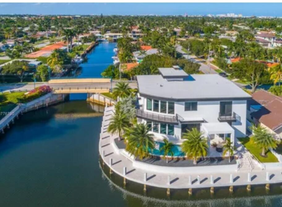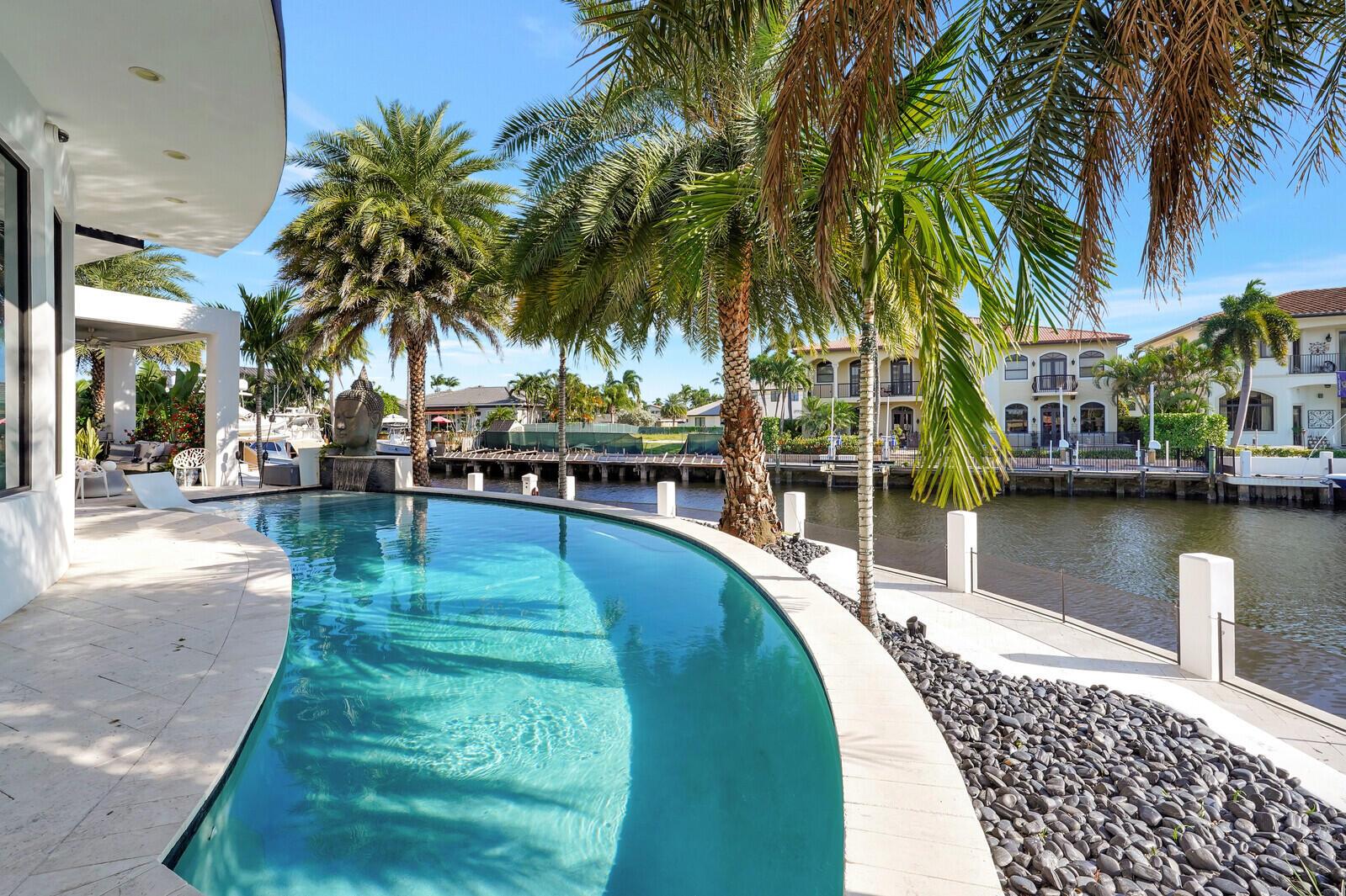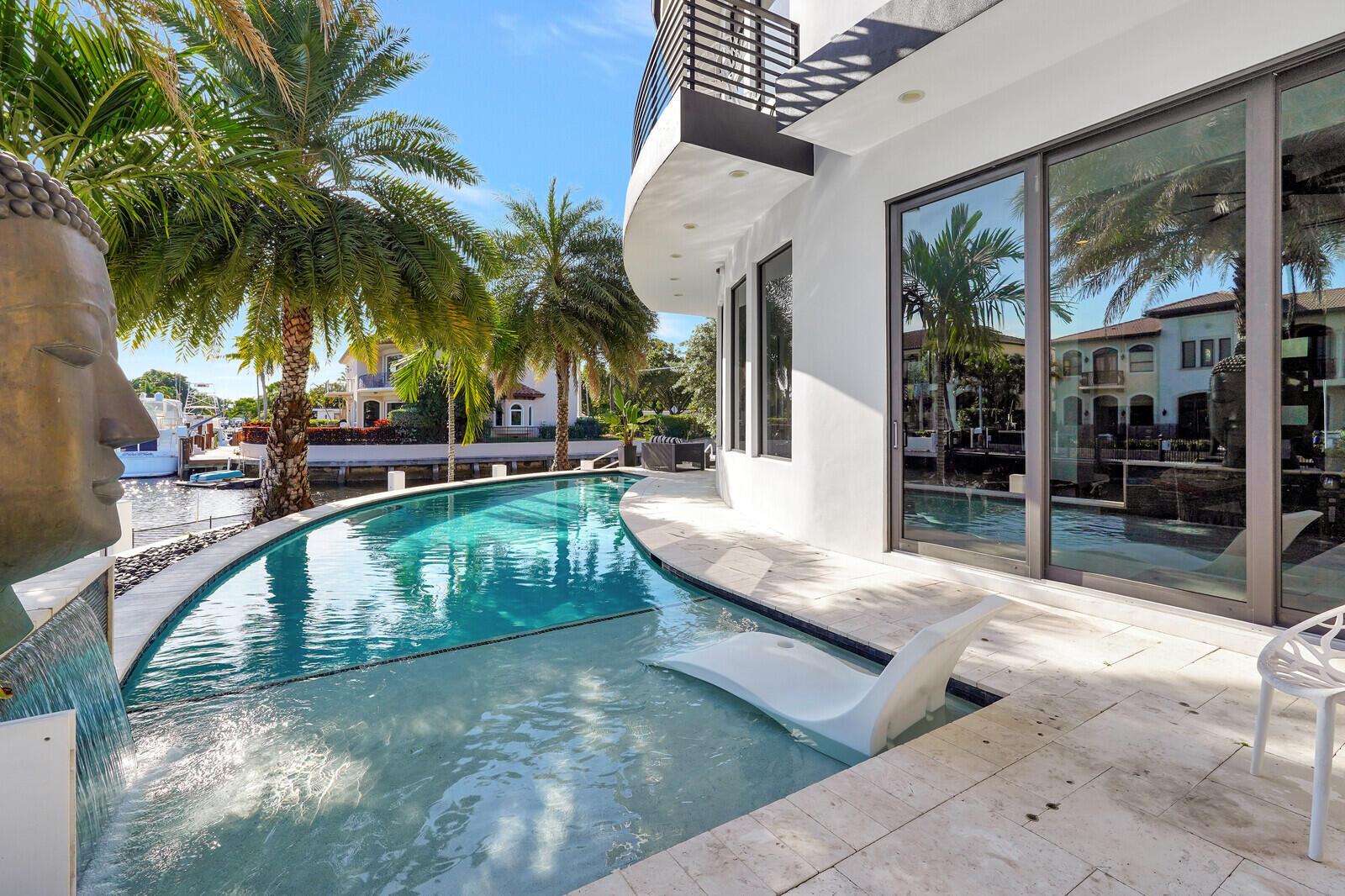 Exceptional Point Lot with 195ft of prime waterfrontage and just minutes away from the intracoastal with easy ocean access and no fixed bridges!! Entertain your guests and family all year long with your gorgeous wrap around salt water pool that is both heated and cooled! Enjoy the abundance of space and light with the morning sunrises gleaming off the water and through your large windows giving you a sense of happiness every morning and night! With 5 extraordinary bedrooms and 6.5 sleek and modern baths, this is a true example of luxurious waterfront living! Rare opportunity to even purchase the home next door as a package if you would like to expand your water frontage and living space! Plenty of room for the toys with a 3 car garage that has AC! Schedule your private tour today!