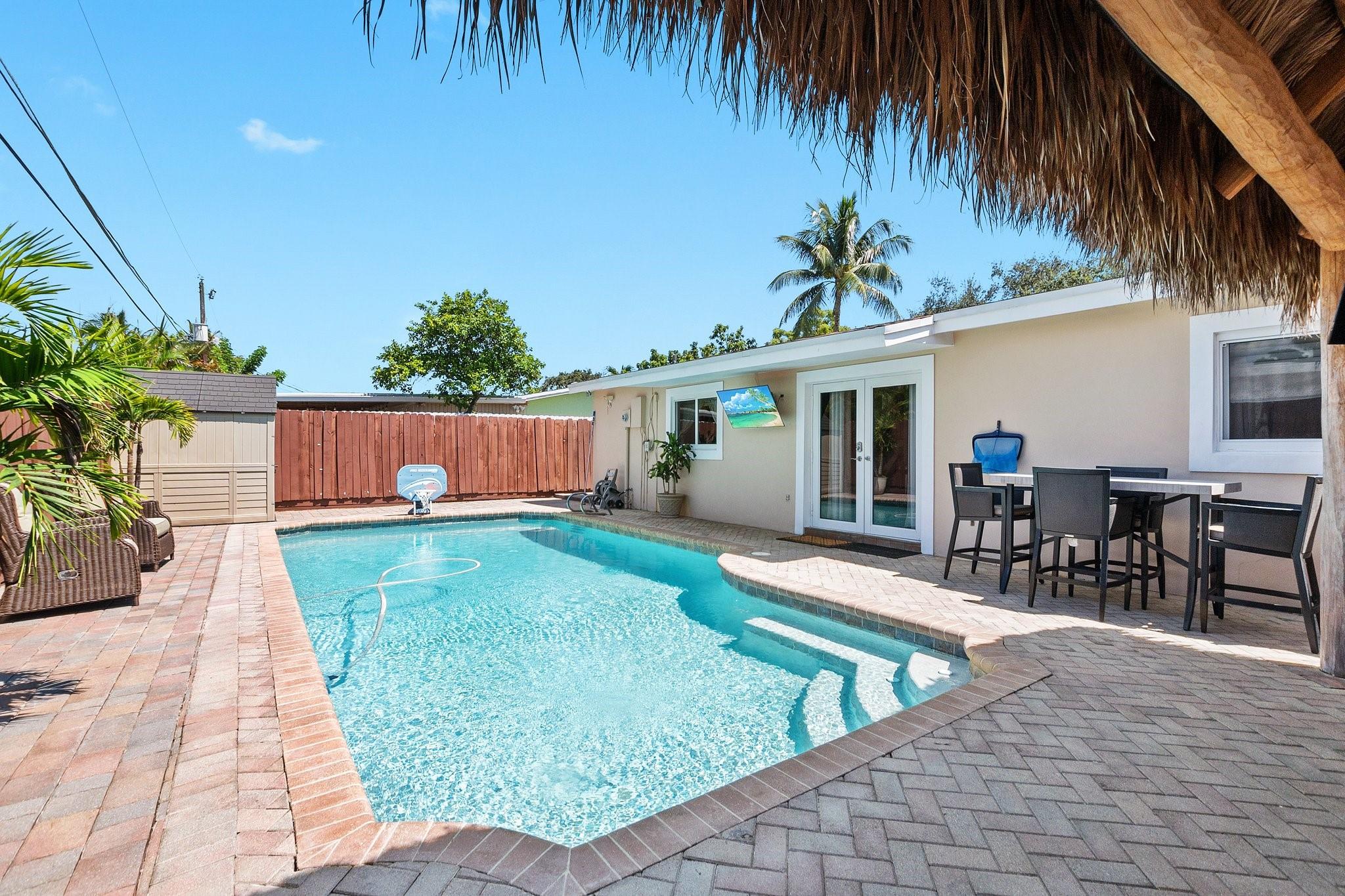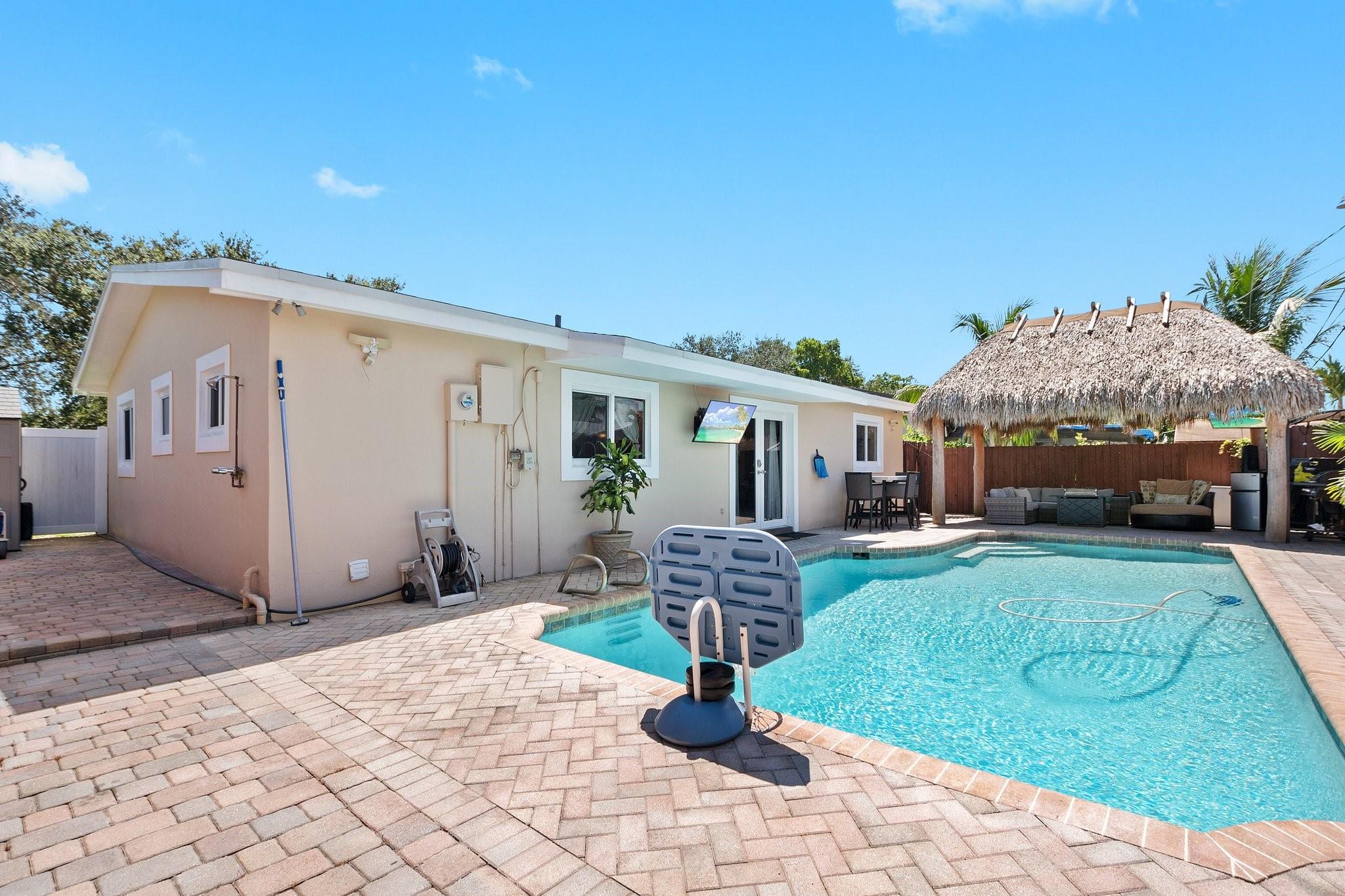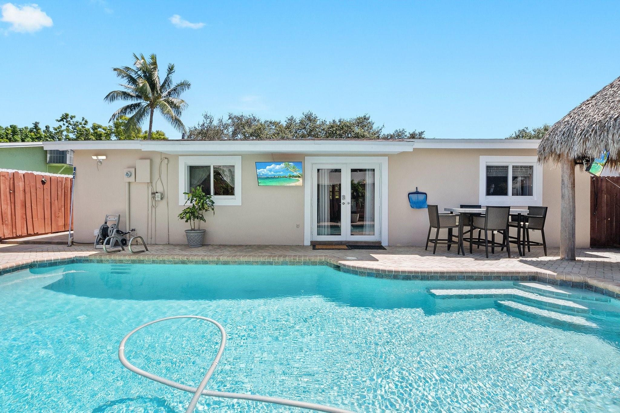 Beautiful remodeled 3 bed, 2 bath heated pool home. With bonus utility/office room. This home comes with hurricane windows throughout. Within the last 5 years a new roof, new a/c new, water heater and stainless-steel appliances were added. The very spacious kitchen has granite countertops with upgraded cabinets. A SMART HOME, it includes security cameras. No HOA. Completely fenced for privacy and paved backyard with a large heated pool. Separate Tiki hut for entertaining. Artificial turf and brick pavers throughout. Desirable location near shopping malls, restaurants, beaches, parks and Hard Rock Hotel.