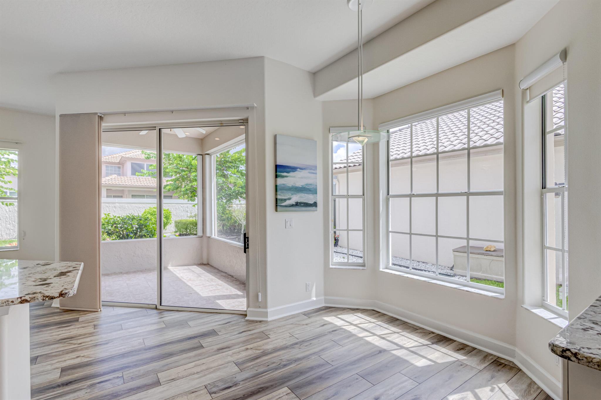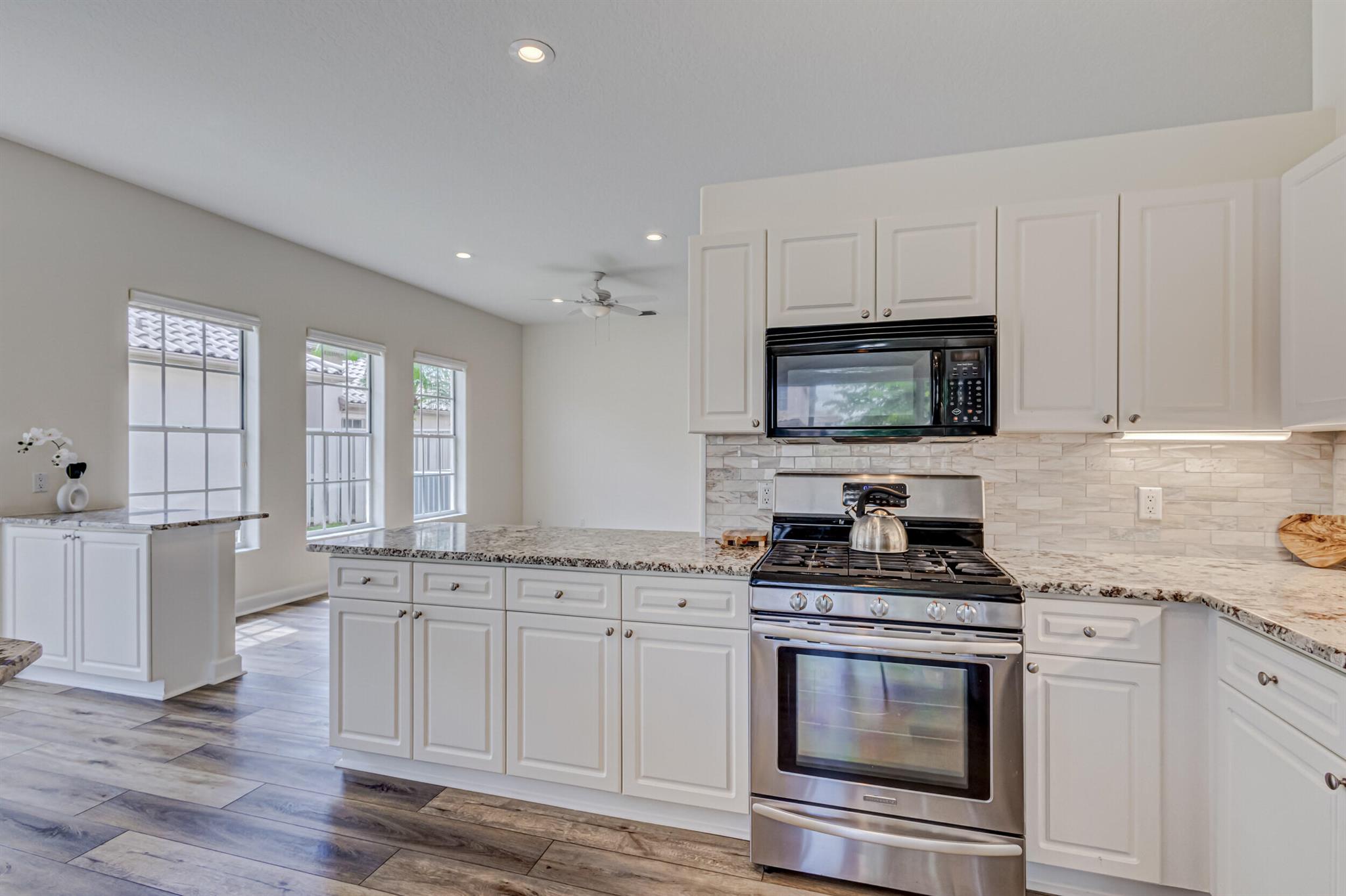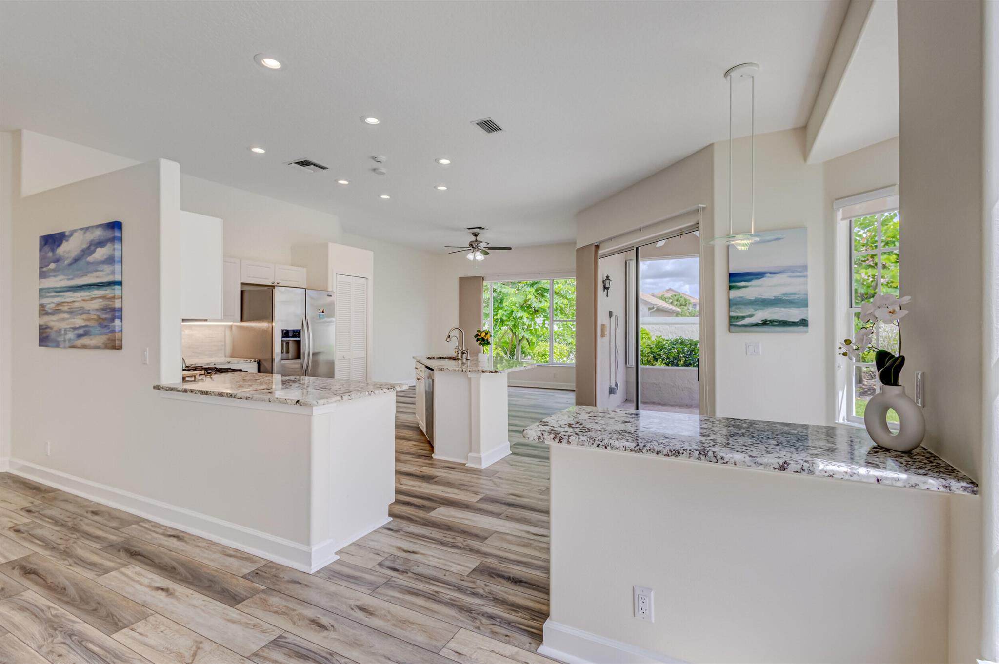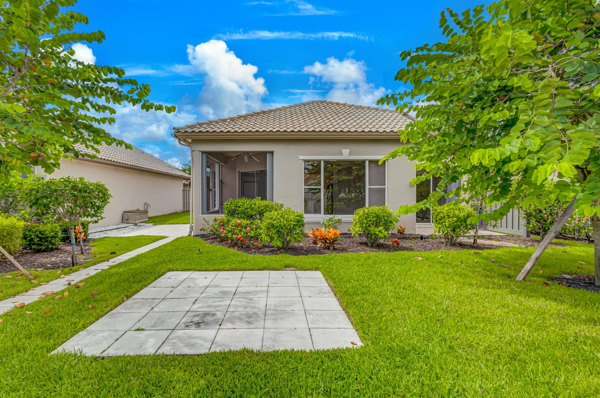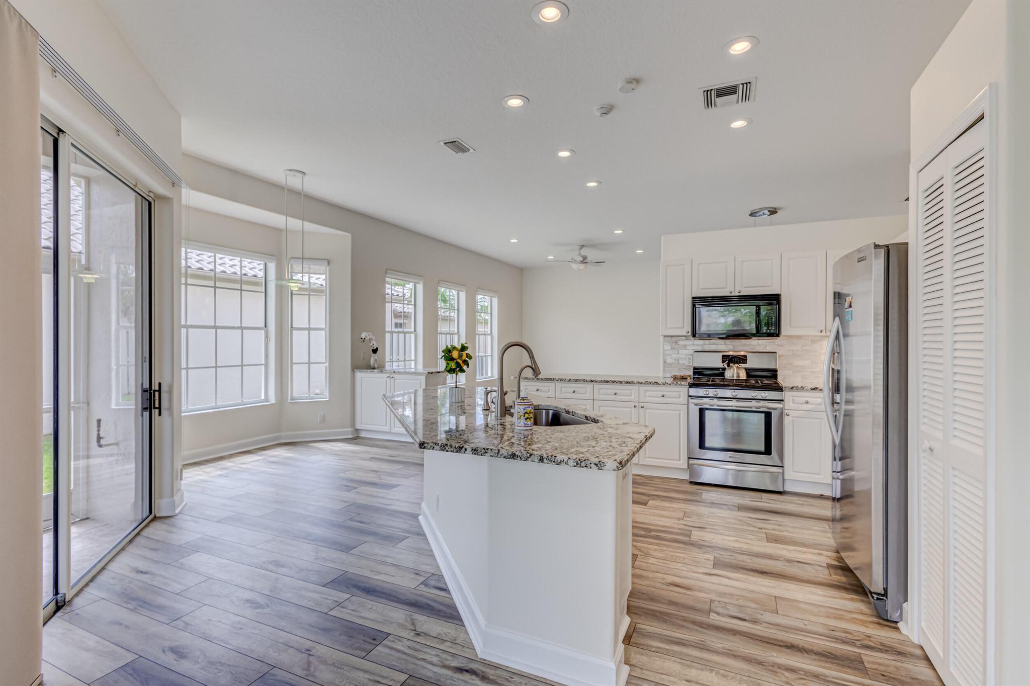 Resort Lifestyle in this light-bright fully renovated 3 bedroom 3 bath wheelchair-accessible house in the double gated community of Eagleton in the PGA Golf Resort. Open and spacious floor plan 3 bedrooms including a spacious Owner’s Suite with a spa-like bathroom and custom built closets. The third bathroom features a walk-in jacuzzi tub. Laundry Room with a quartz counter top and a stainless-steel sink. This house feature simulated wood porcelain tile floors. Open bright gourmet kitchen with gas stove, custom cabinetry, granite countertops with a large eat-in island. Enjoy private backyard with a screened patio. 2 car attached garage includes extra storage. House is within short walk to the community pool. In the heart of PBG. Also nice quite neighborhood with no traffic noice.