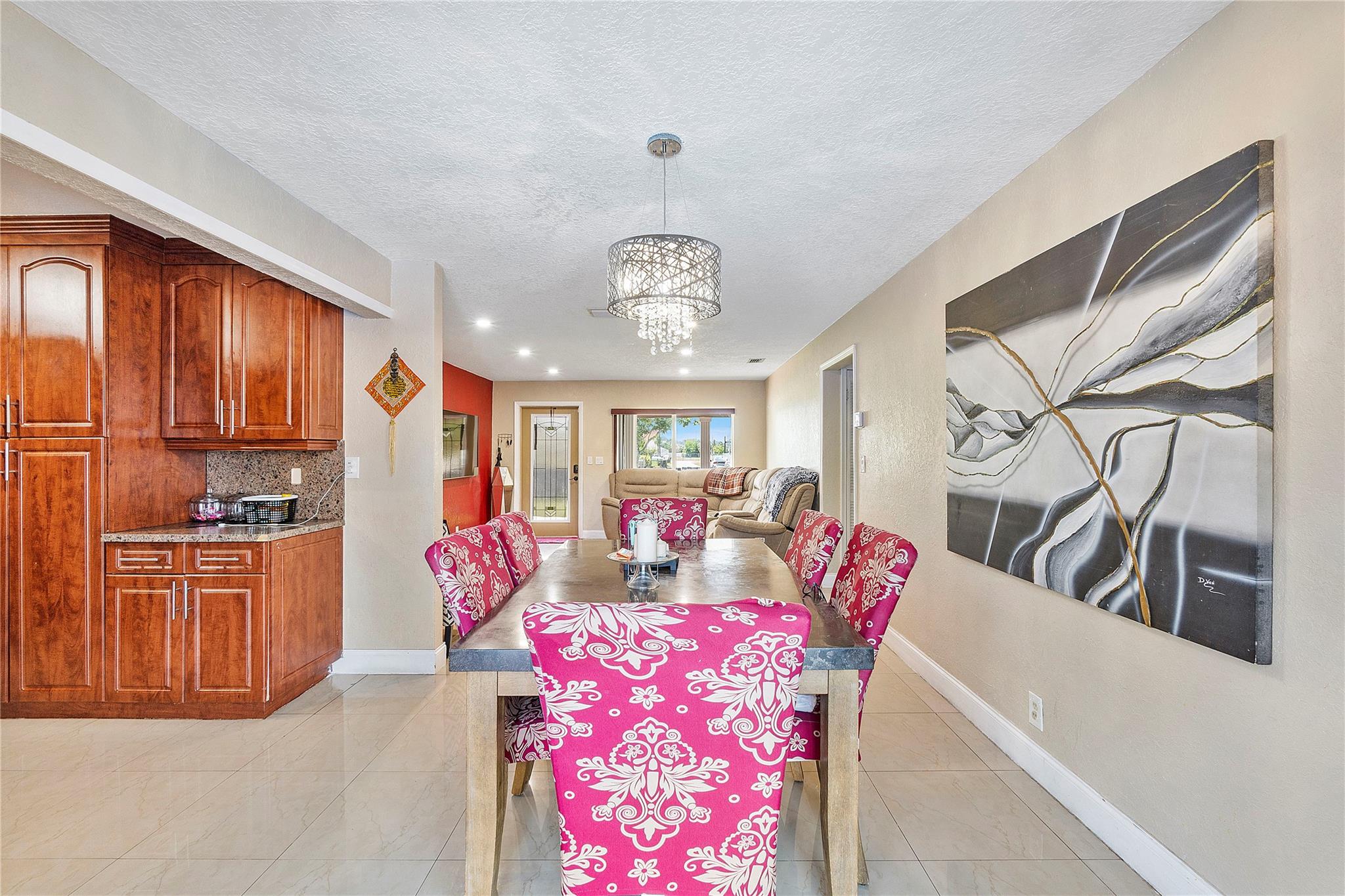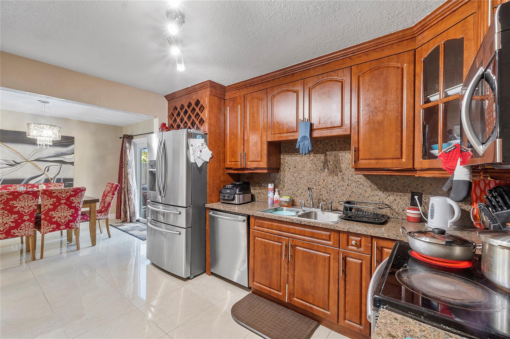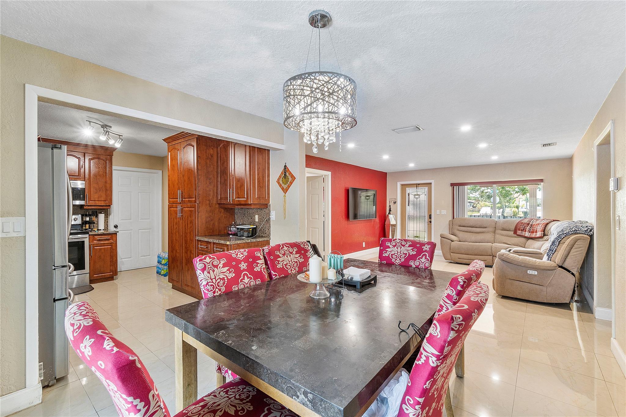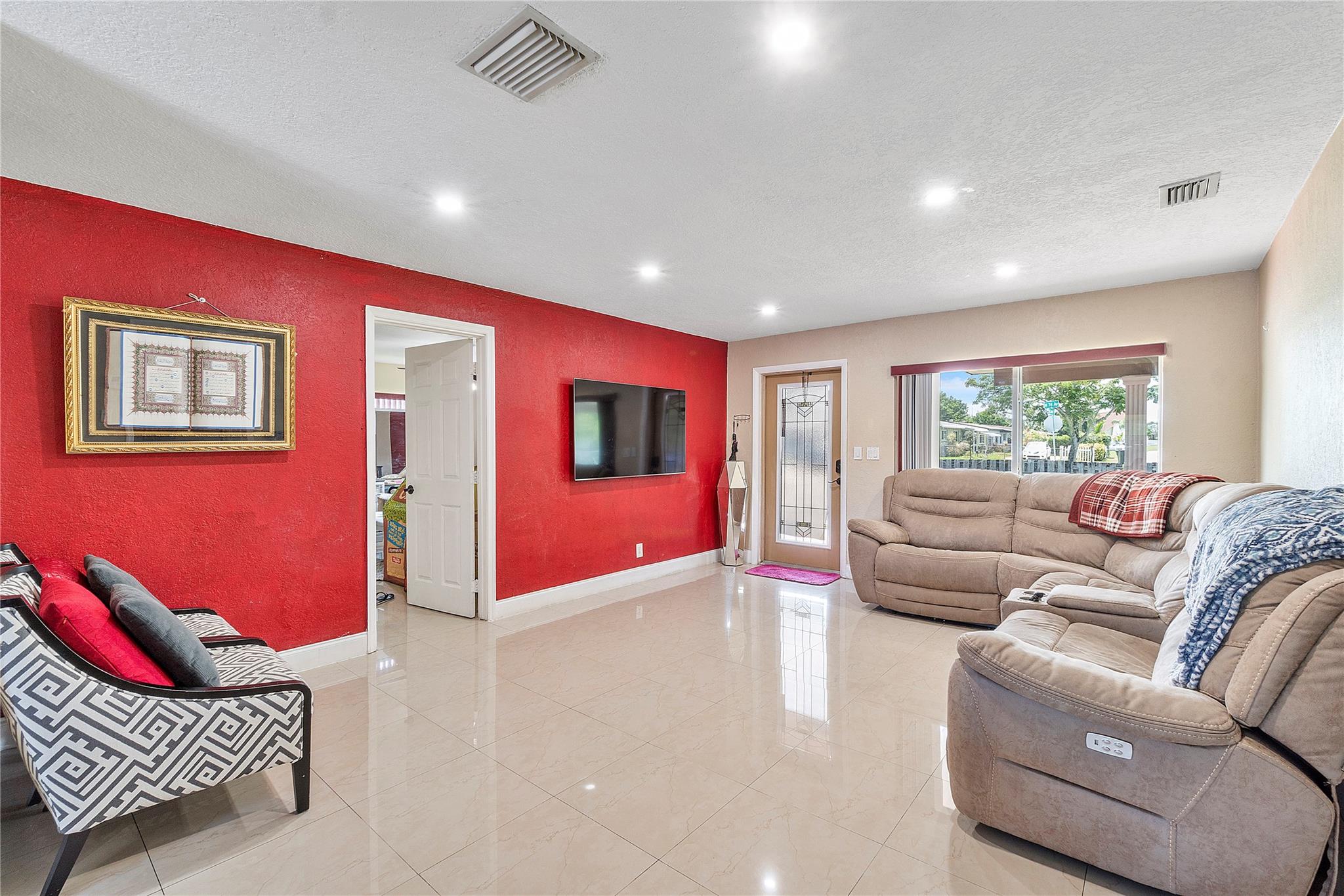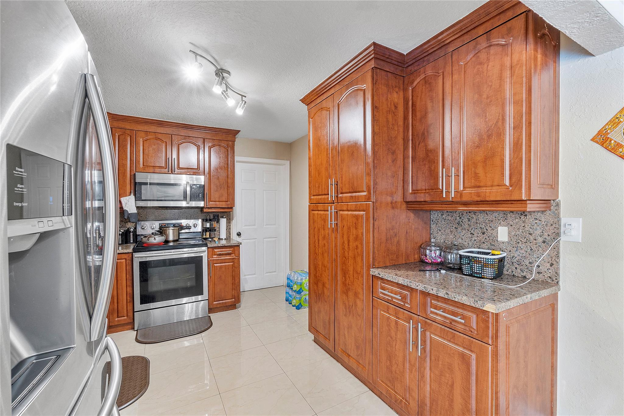 A separate laundry room is available. Porcelain tiles throughout the house. The kitchen is equipped with sleek stainless steel appliances and features a brand-new microwave. Roof replaced in 2016 and A/C replaced last year.