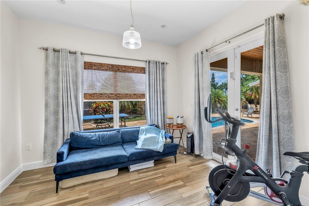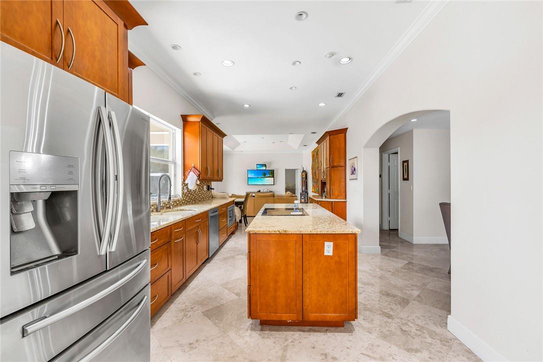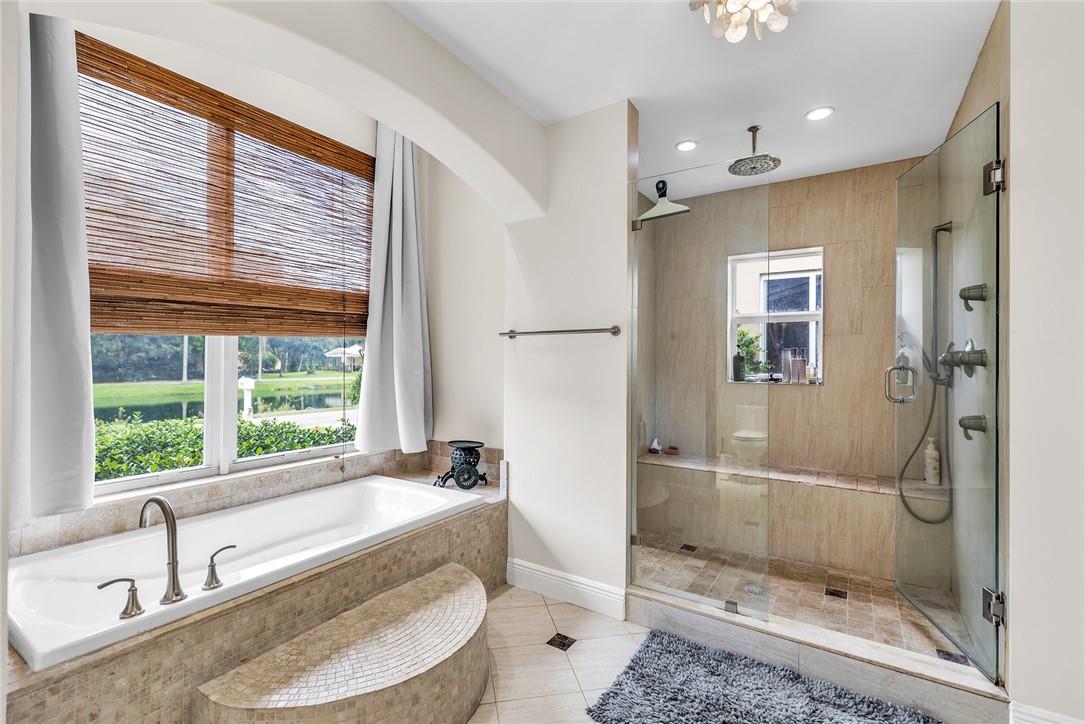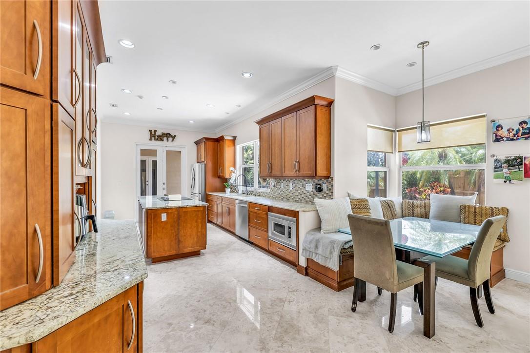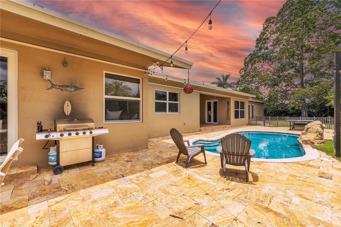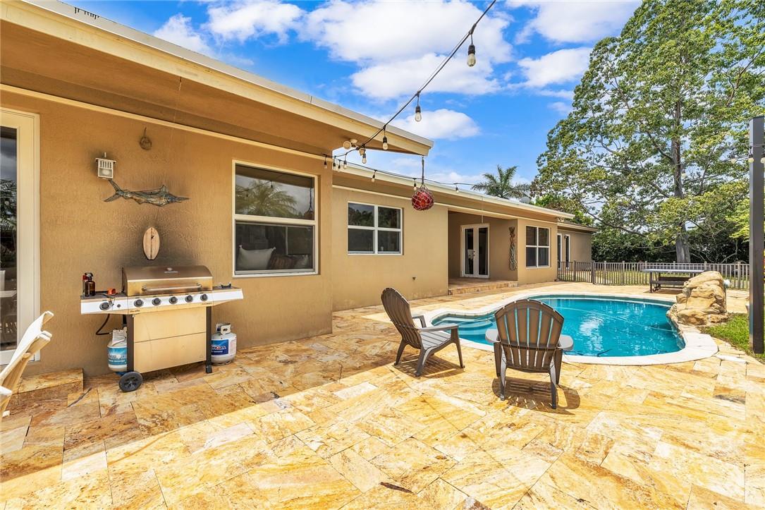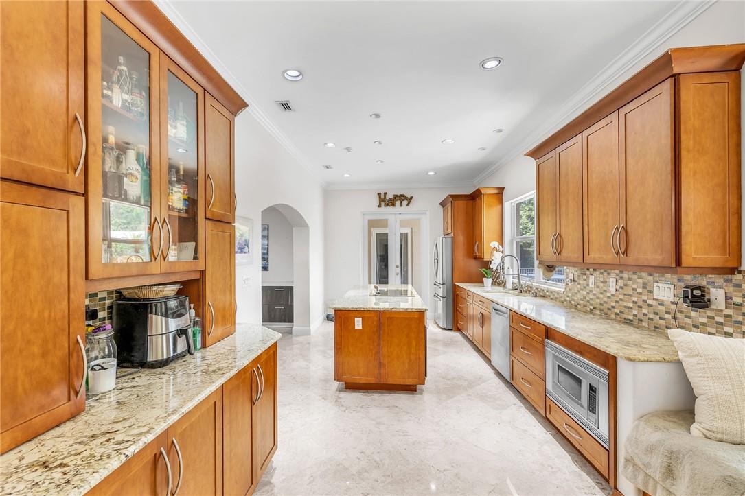 A beautiful 4 bedroom, 3 1/2 bathroom with a pool in Davie, Florida. Nestled on 9/10ths of an acre you will find this home to check off you “most wanted” list. This home was totally remodeled and sellers built/added a extra deep 32 foot deep 3 car detached garage on the property that has a/c. The split floor plan features a child’s playroom dream that has 2 bedrooms & 1 bathroom. Other loves are the double sided fireplace, customer kitchen design, granite kitchen counter tops, stainless steel appliances, polished marble flooring throughout the home, impact windows & doors, a July 2023 barrel tile new roof, large pool area that is fenced in, master bedroom suite & 4th bedroom is an e-suite. Large lake in the front of the home, security system & no HOA.