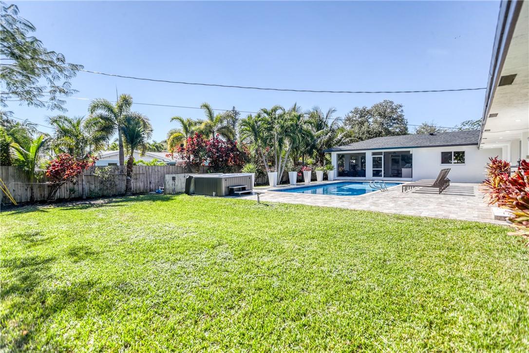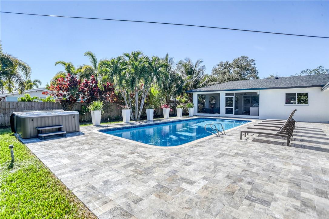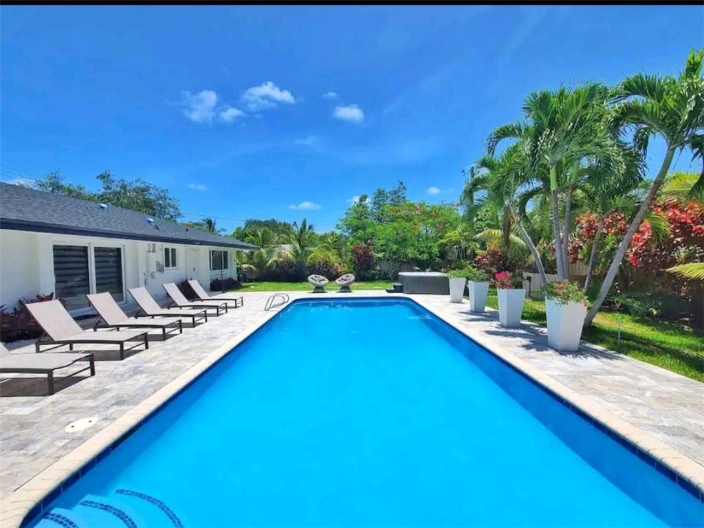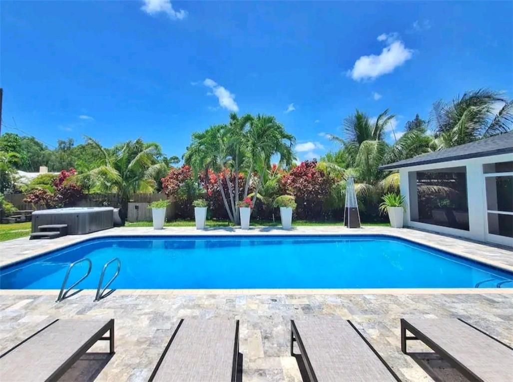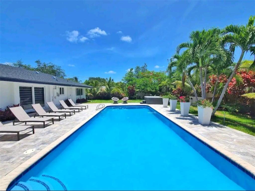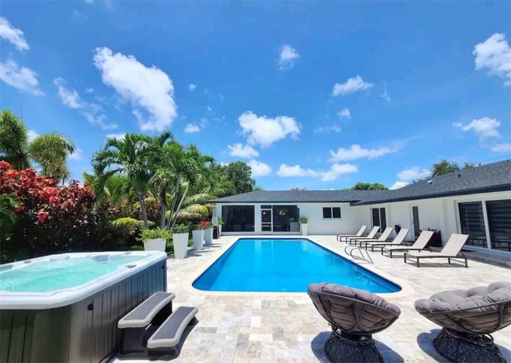 Welcome to the coolest home in Pompano Beach! Stunning resort-style residence, where classic elegance meets modern sophistication, rebuilt & redesigned from top to bottom, offering brand new house living experience. With a stunning large pool, breathtaking landscaping views, a large screened-in patio boasting an outdoor kitchen & dining area, outdoor shower, jacuzzi, children’s playground, waterfall, fire pit, game room, & more. Situated on an expansive doable size property lot spanning over half an acre. Furnished with top-notch appliances and fixtures. Be impressed by the huge spacious dream kitchen, with high-quality cabinets, build in mirowave, wine cooler & much more. Boasts 5 bed and 3 full baths, perfect for large family or guests. Enormous driveway can accommodate 10+ vehicles.
