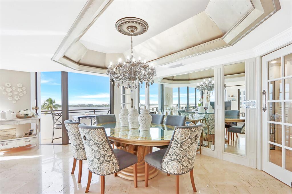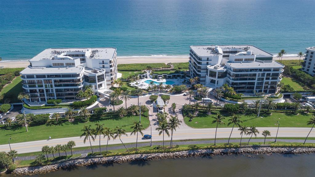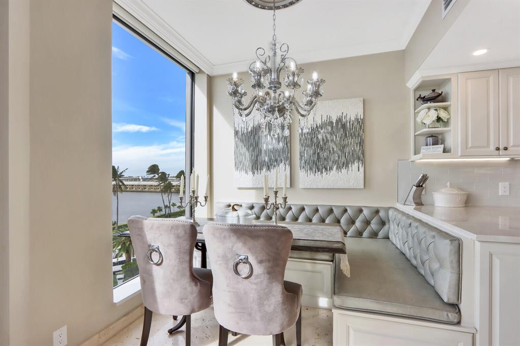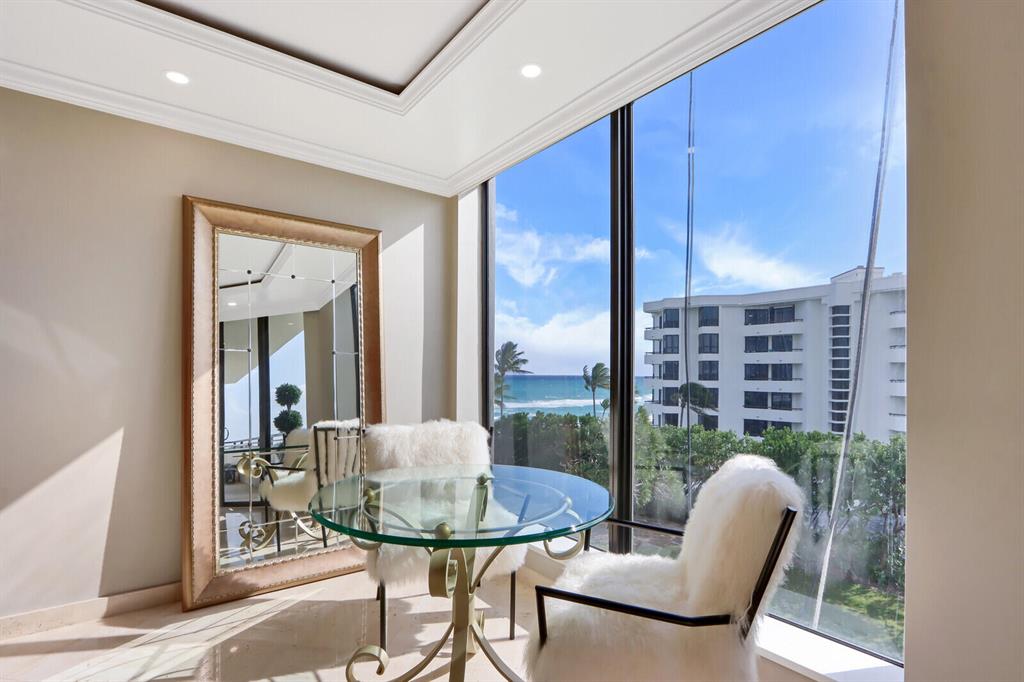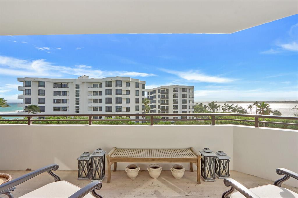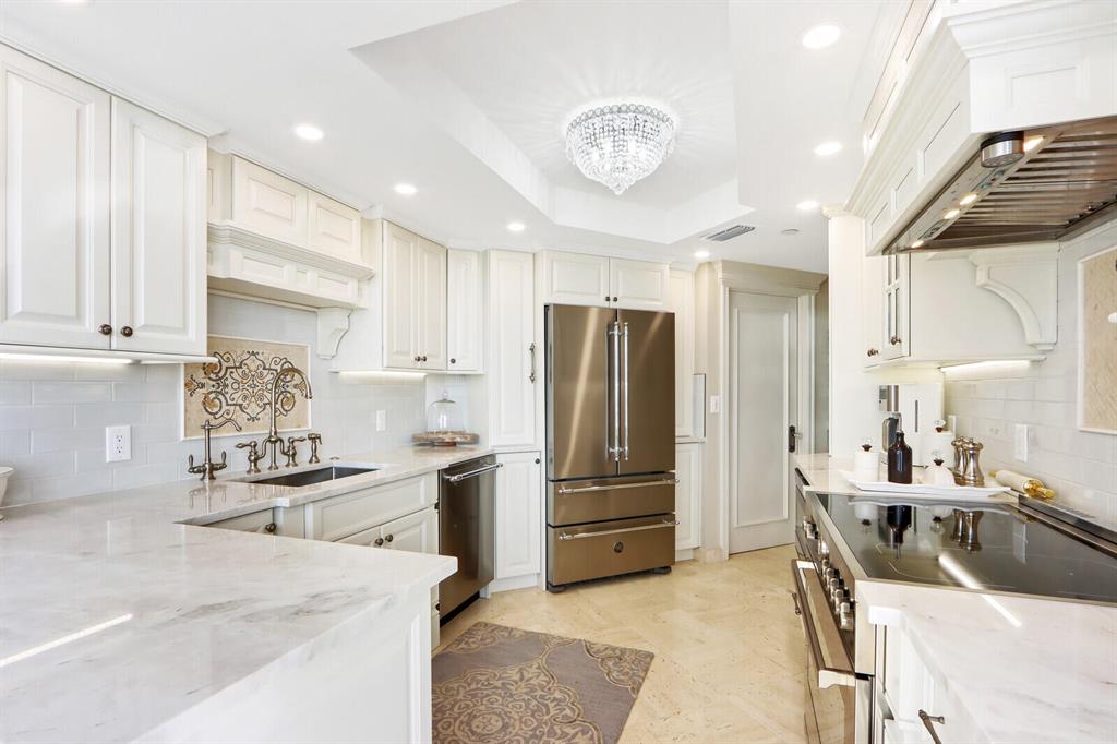 Exquisite renovation by designer/owner is breathtaking in this spacious southern corner unit. With parquet marble floors throughout, clean lines and stylish elegance, this Classic/Modern designed home offers expansive views of the ocean or intracoastal from all major rooms including the dramatic entry, wide-open living room and dining area. No detail has been overlooked from the custom millwork and cabinetry in the kitchen, bedroom suites, master bath, dressing room, and second bedroom library unit. Enjoy the all-white kitchen that features Italian Bertazzoni appliances and a charming built-in breakfast leather banquette overlooking the intracoastal. Home features include Toto sinks & Kohler toilets.