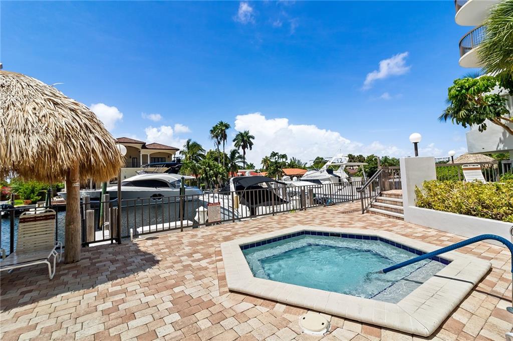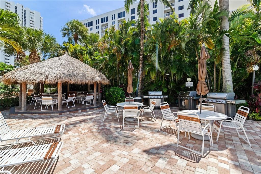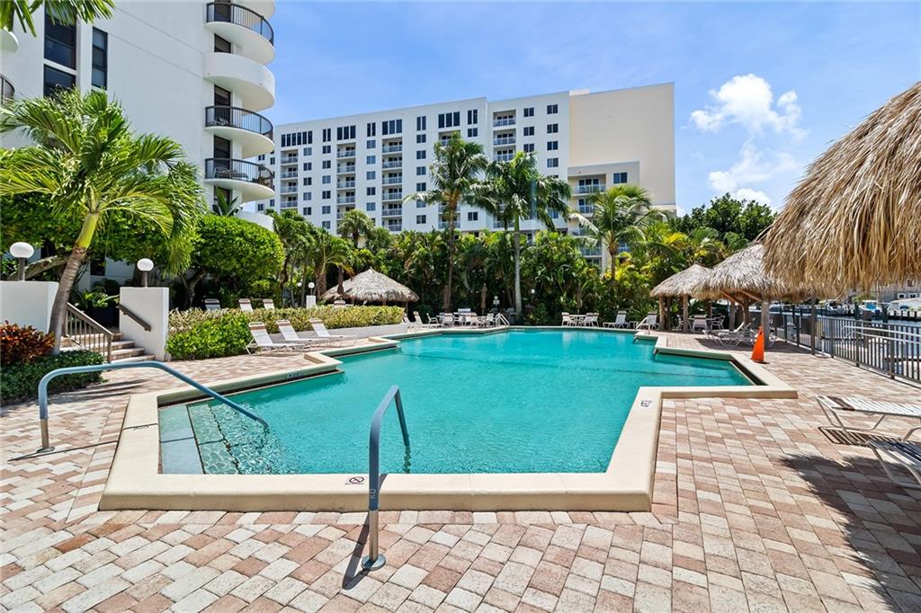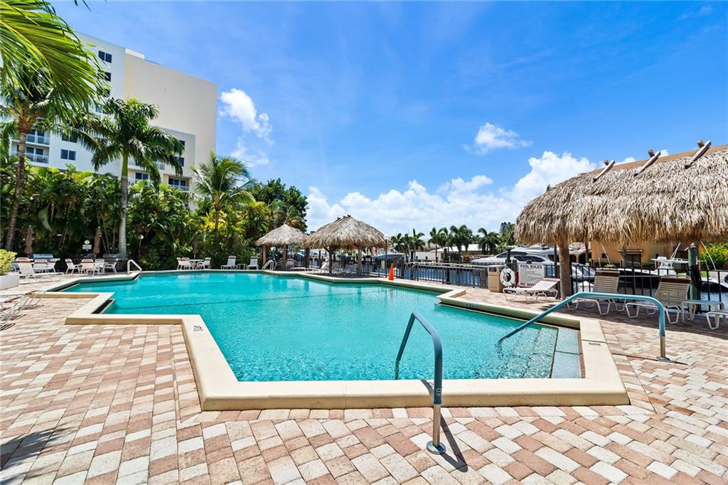 The building features a resort style pool and hot tub, BBQ grills, and Tiki Huts.